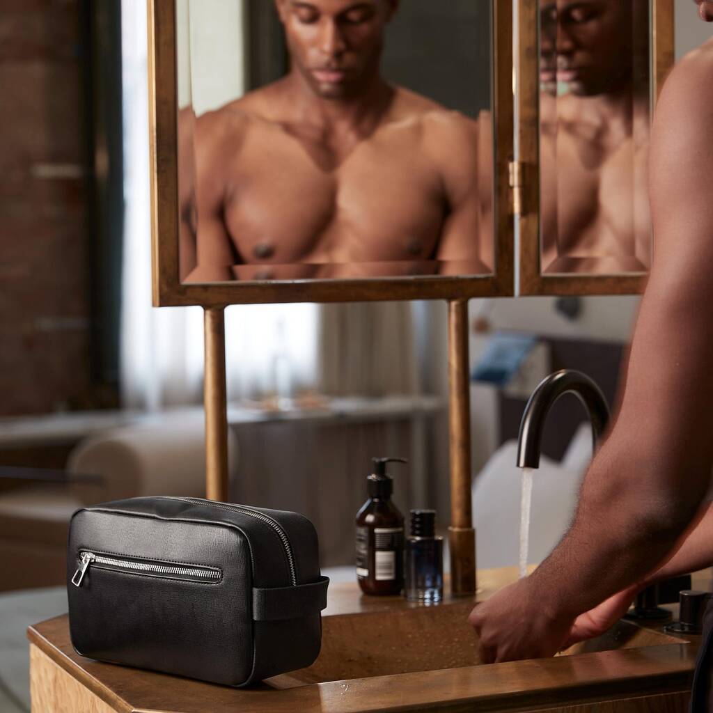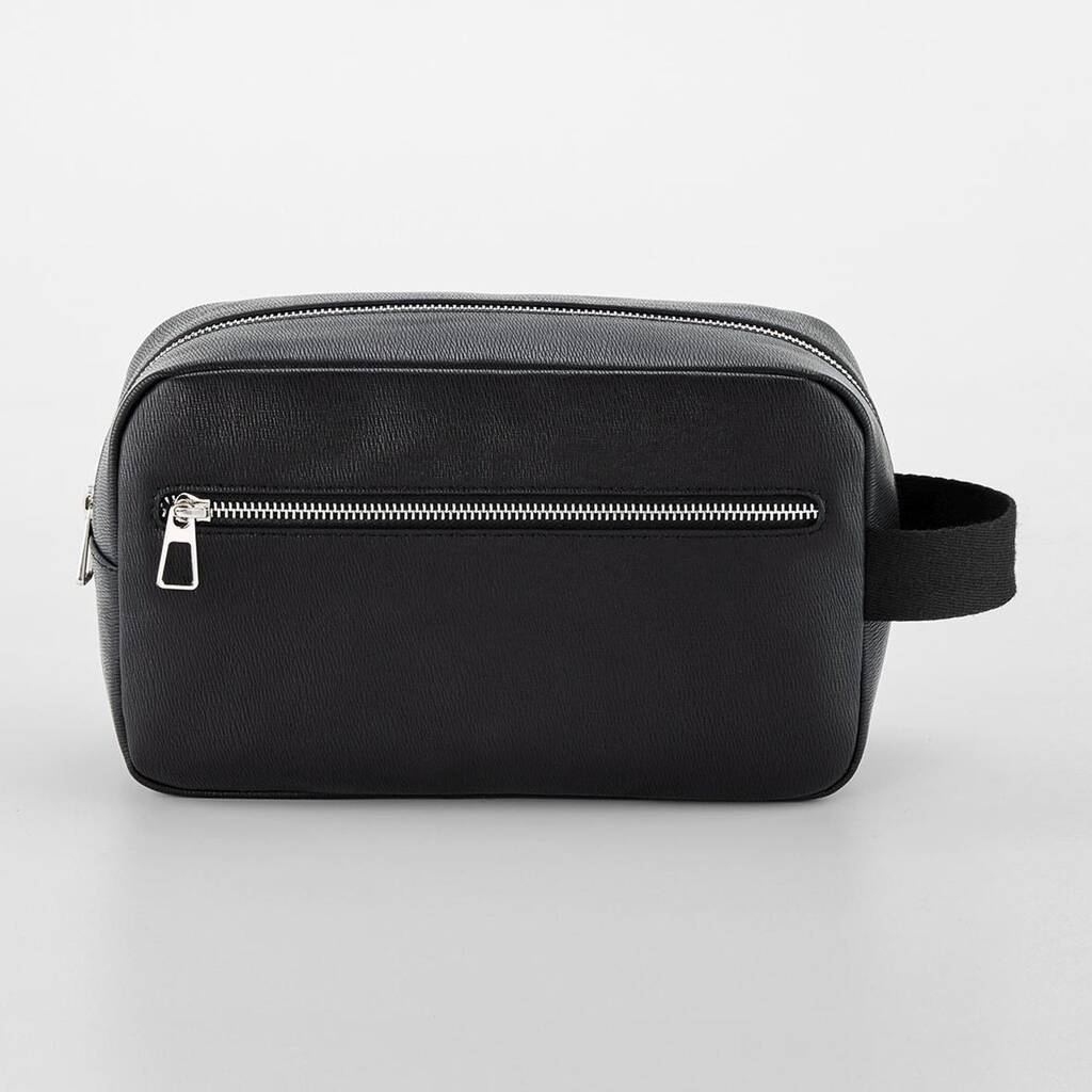 Inside, practical compartments include a zipped pocket, a zipped front pocket, and two slip pockets to keep grooming products secure. The wipe-clean finish makes it easy to maintain, while its structured silhouette ensures it keeps its shape in use or travel.