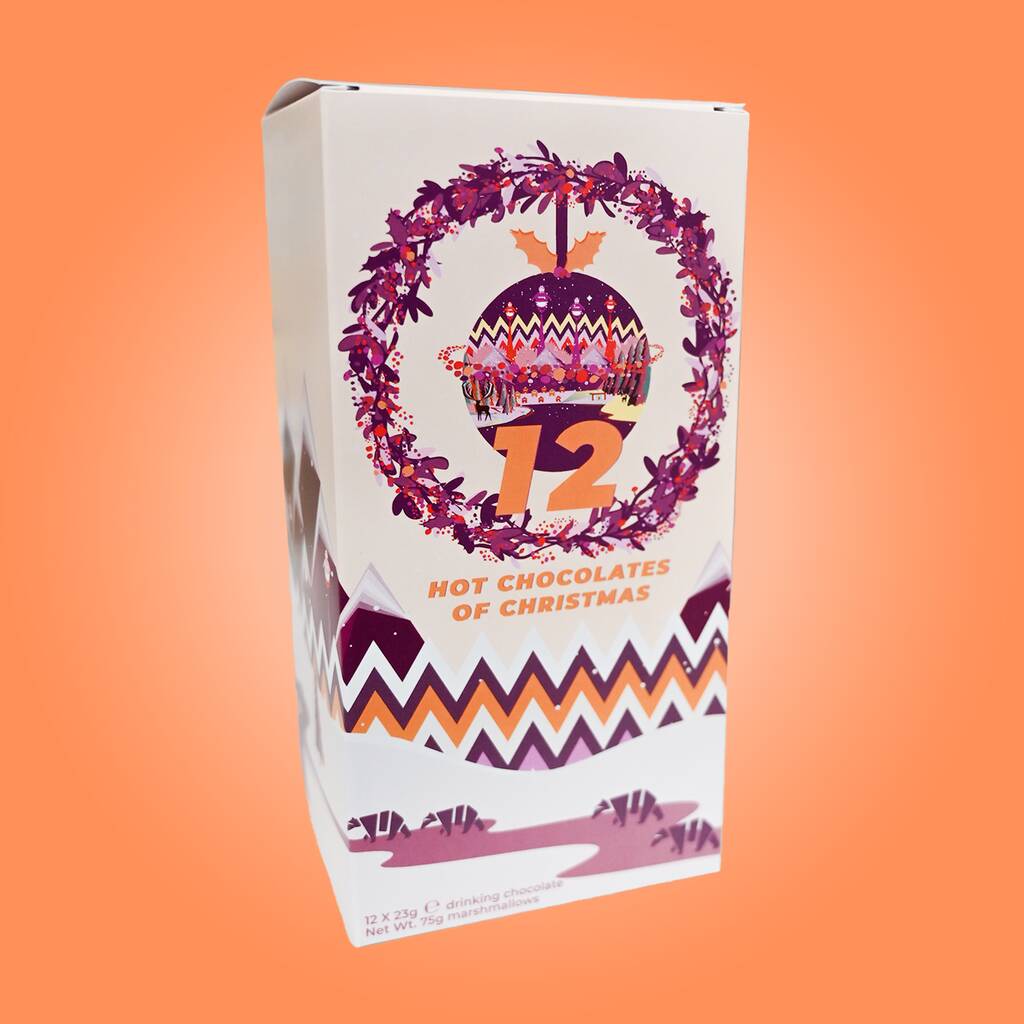 Twelve Blends include: Salted Caramel, Christmas Carrot, Dark, Chocolate Orange, Winter Spice, Candy Cane, Caramel Rum Pud, Mince Pie, Winter Cranberry, Chocolate Biscuit, Cinnamon Roll, Pumpkin Boo. One sachet contains one perfect cup! The blends do not contain any dairy but do have a 'may contain milk' warning.