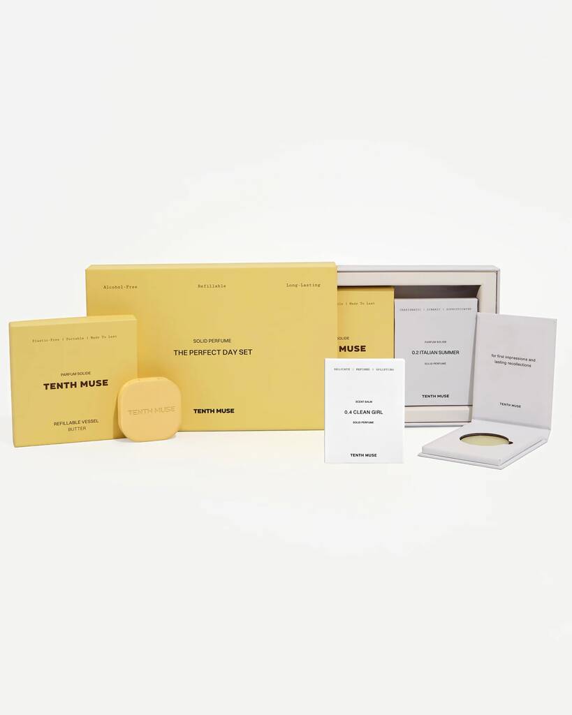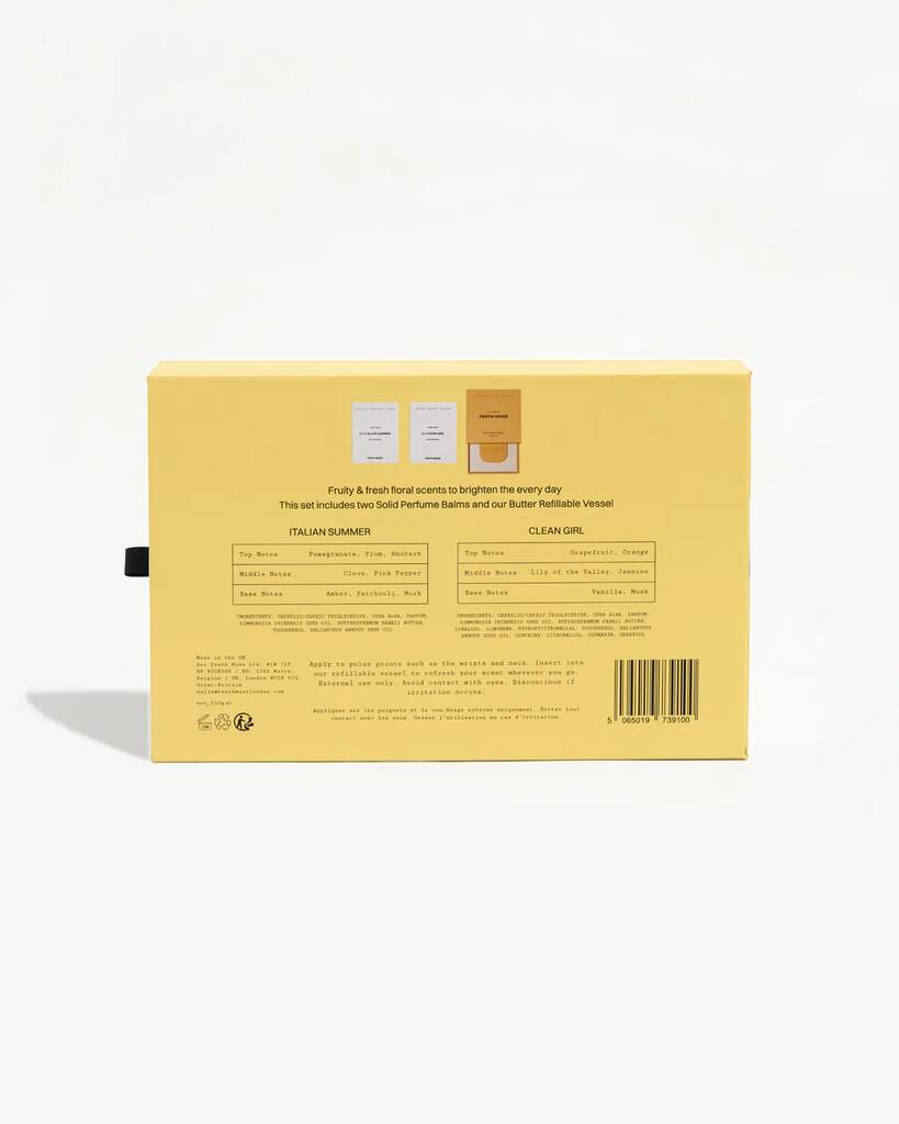 This set includes: x1 Italian Summer Solid Perfume Balmx1 Clean Girl Solid Perfume Balmx1 Butter Refillable Vessel