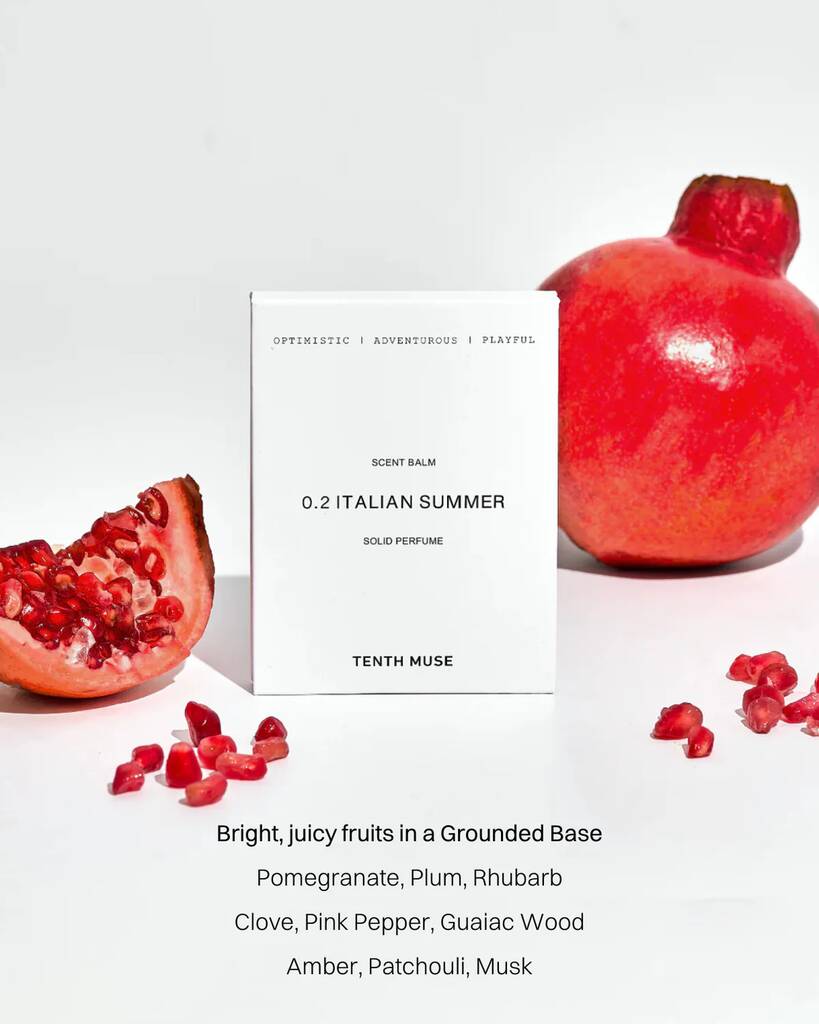 Italian Summer Notes:Top notes: Pomegranate, Plum, RhubarbMiddle notes: Clove, Pink Pepper, Guaiac WoodBase notes: Amber, Patchouli, Musk