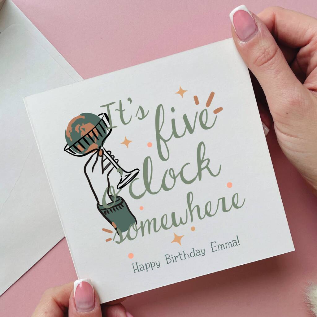 Personalised cocktail birthday card with name. Fun “It’s Five O’Clock Somewhere” design for friends, mums or anyone who loves a celebratory drink.