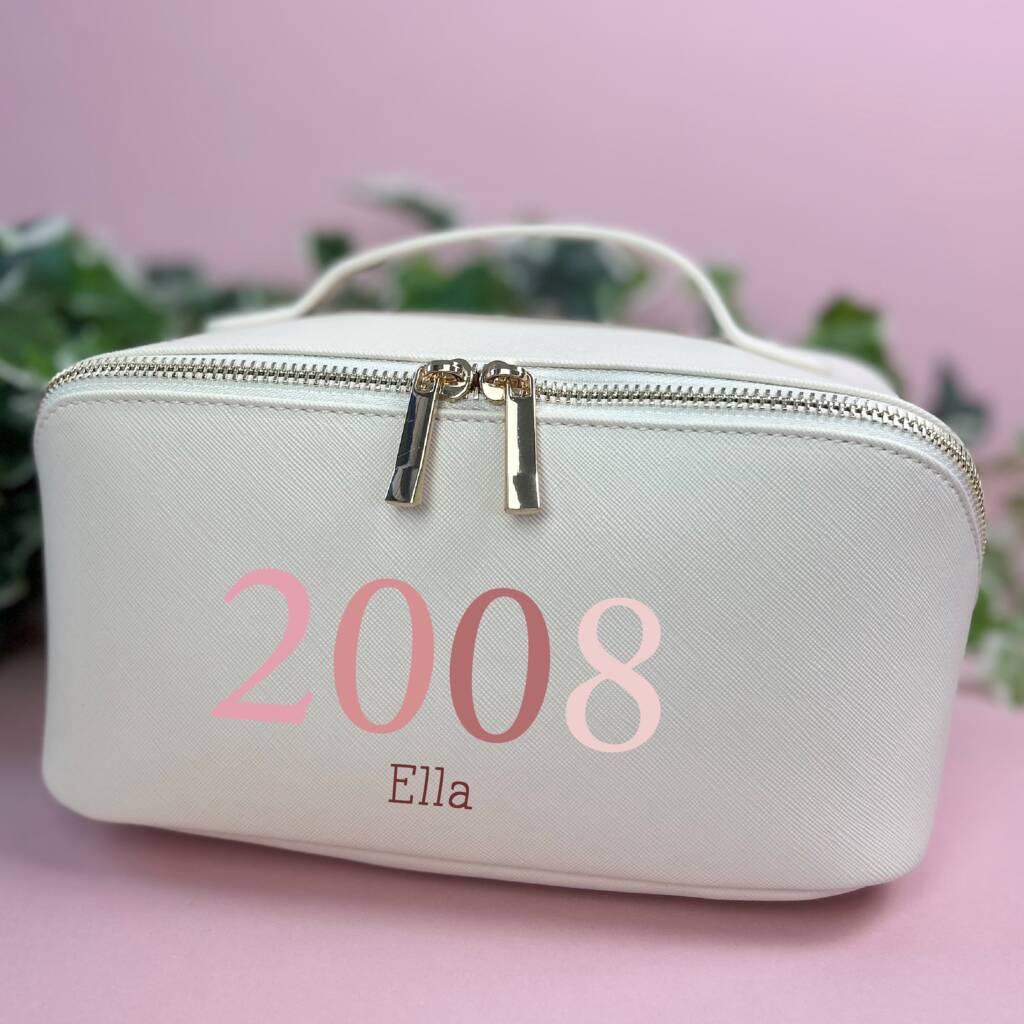 Personalised 18th birthday makeup bag, custom name and birth year 2008. Stylish faux leather keepsake, perfect gift for her.