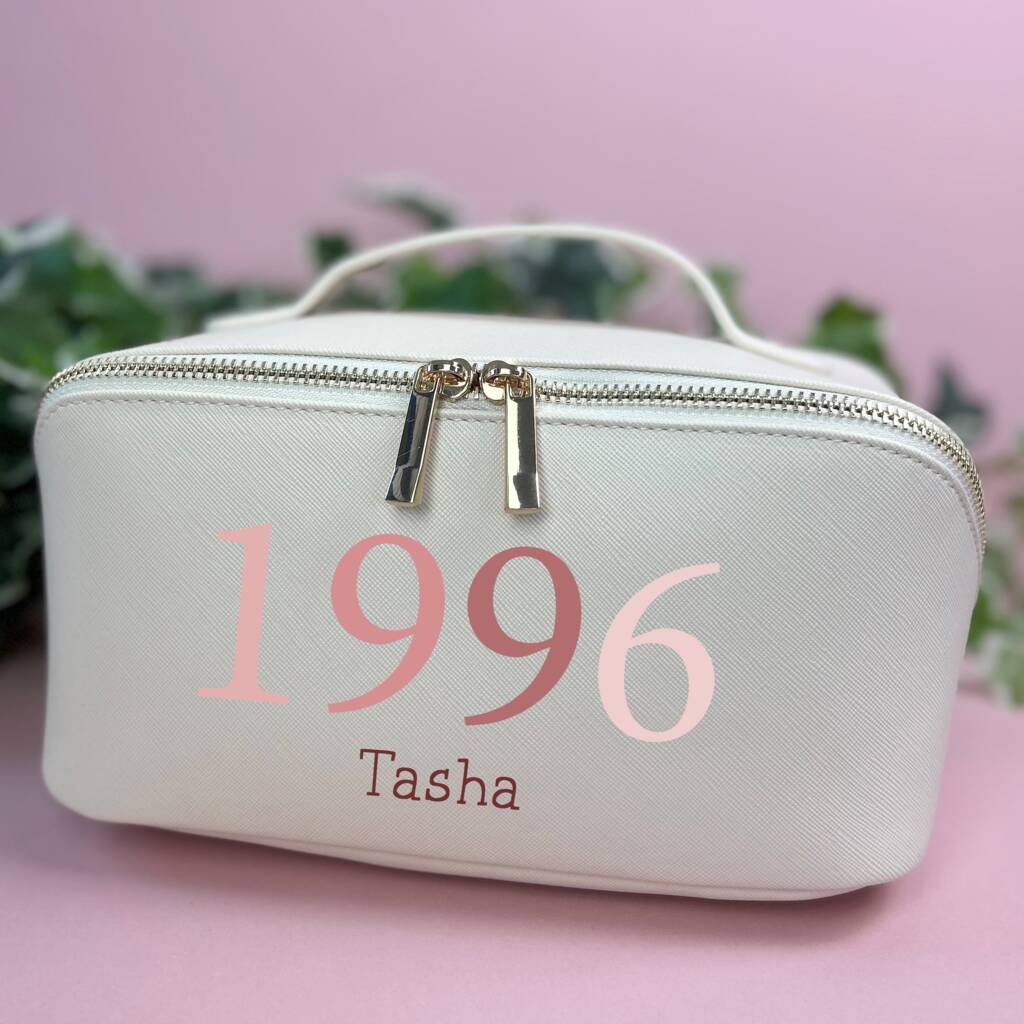 Celebrate a milestone in style with our bespoke 30th birthday makeup bag, featuring a timeless design tailored for the occasion. Crafted from premium faux leather, this versatile accessory is emblazoned with the iconic year of birth - 1996. Customise it with the recipient's name for a personal touch. Perfect for storing daily essentials or for travel, this bespoke gift is a delightful addition to any makeup collection. Whether it's for a 30th birthday celebration, milestone anniversary, or special occasion, our personalised makeup bag is the perfect way to celebrate in style. Treat yourself or surprise a loved one with this thoughtful and practical gift, sure to be treasured for years to come.