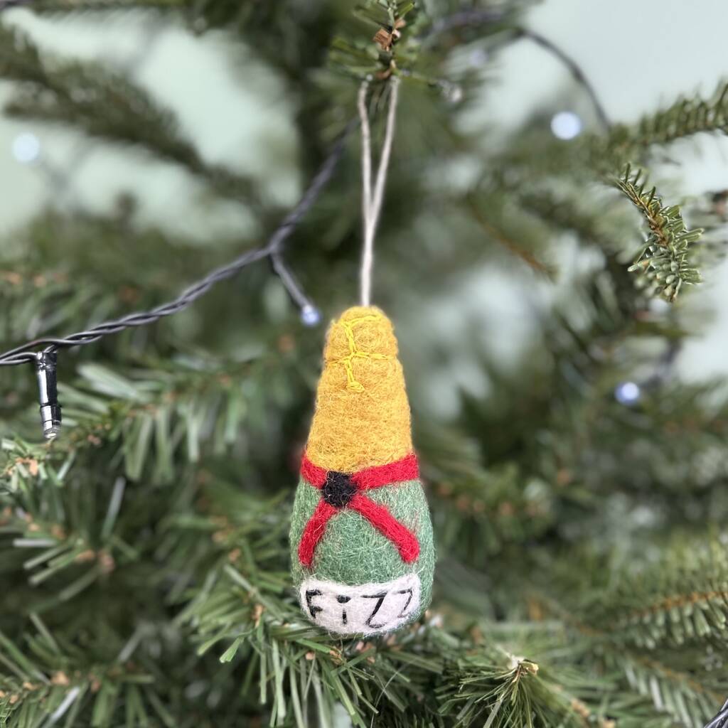 Celebrate life’s special moments with this delightful felt Champagne bottle Christmas bauble. Handmade in festive green, gold and red felt, the bauble resembles a classic Champagne bottle with the word “Fizz” embroidered on the label, adding a playful and cheerful touch to your tree.