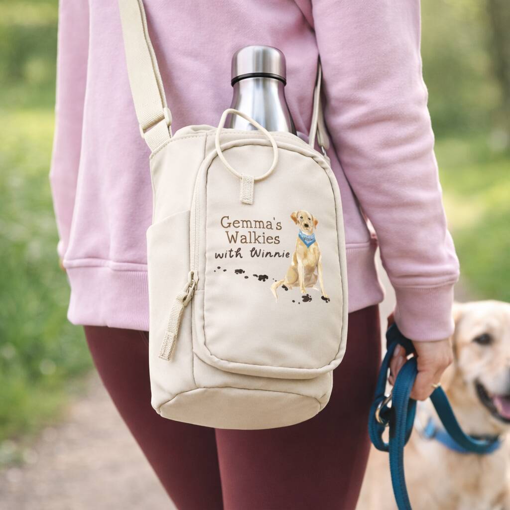 Personalised dog walking water bottle carrier with dog illustration and names. A practical crossbody bottle bag gift for dog lovers and daily walks.