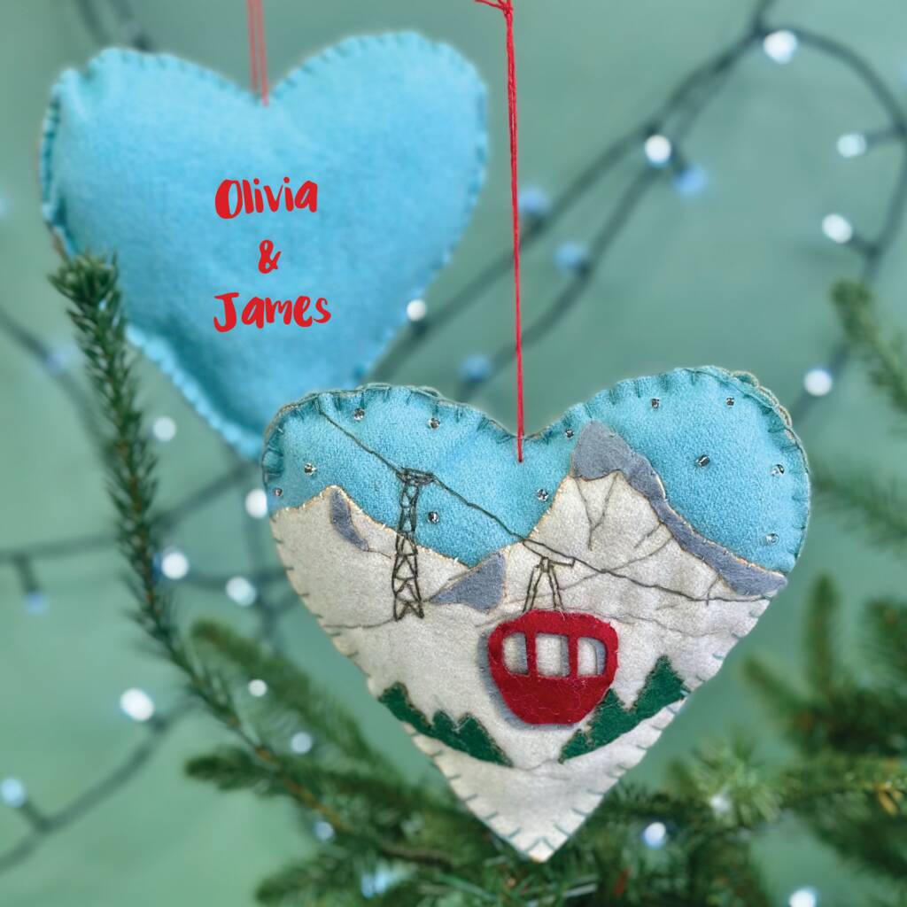 Capture the magic of the slopes with this personalised felt heart bauble, carefully handmade from soft felt and lightly cushioned to create a charming, three-dimensional decoration. The front features an intricate mountain scene complete with a felt ski car, snow-capped peaks, and skiers in action, all meticulously stitched for a playful yet detailed design.