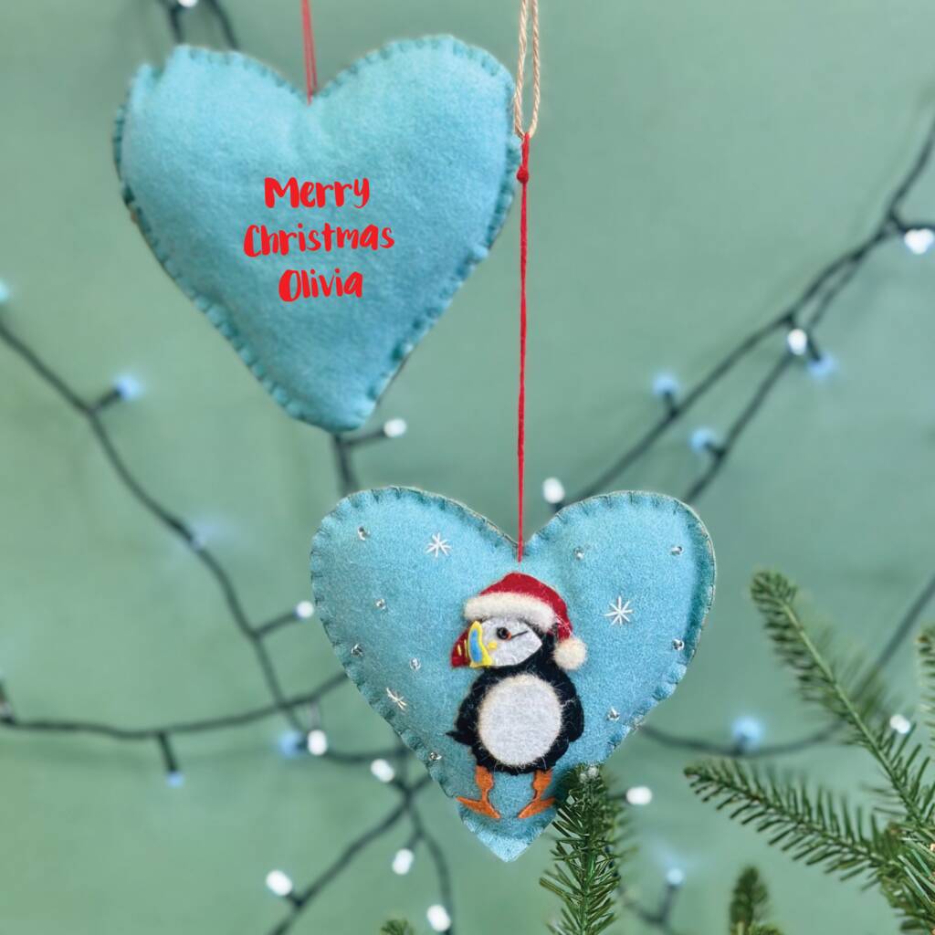 Handmade felt puffin heart Christmas decoration with embroidered star, personalised with your chosen name or message for a unique festive bauble.
