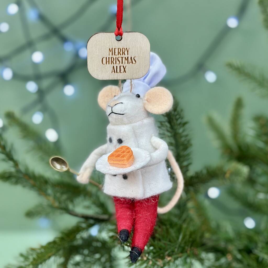 Personalised felt chef mouse Christmas bauble with engraved tag. Perfect gift for bakers, food lovers, or as a Secret Santa gift for a chef.