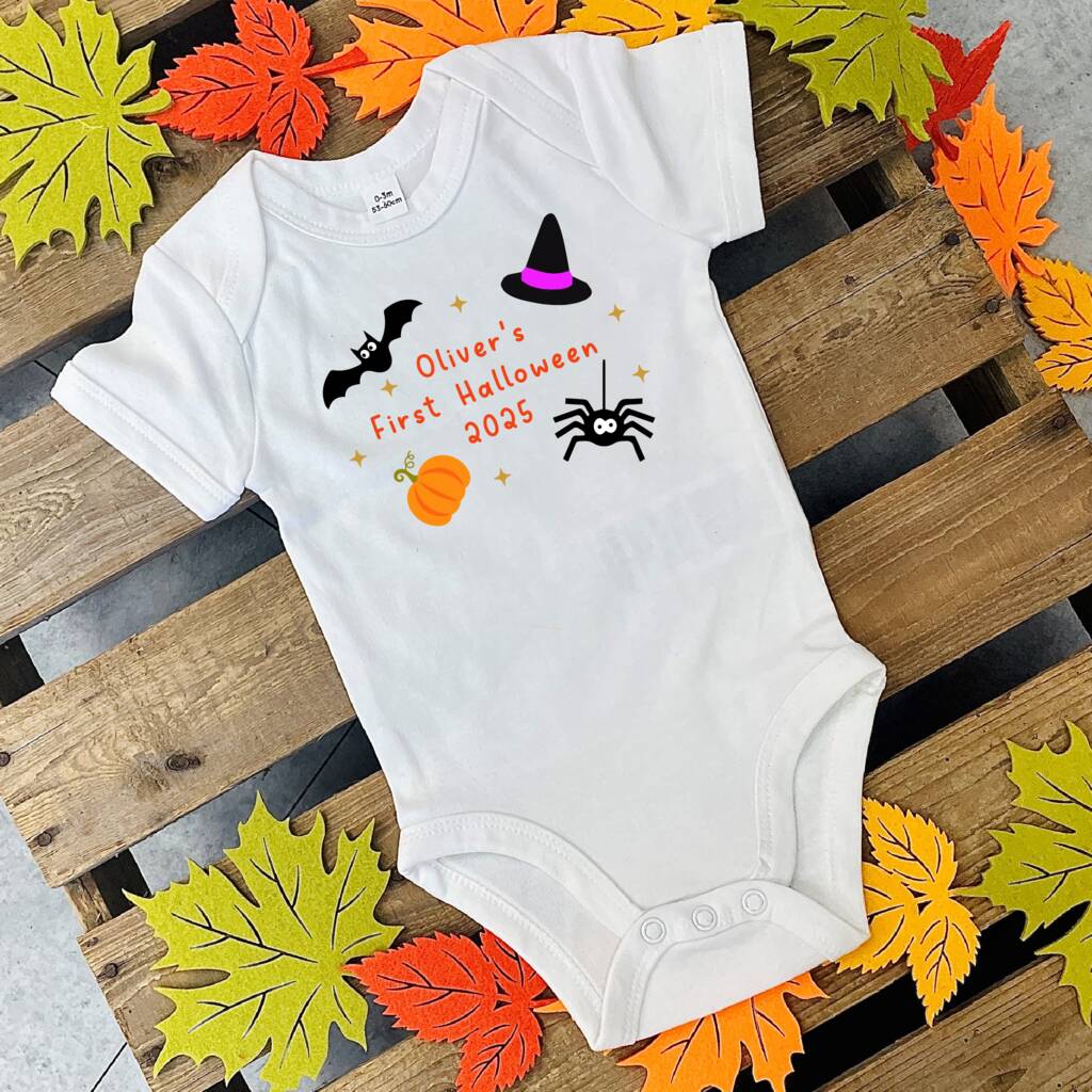 Personalised Halloween baby vest with name, “First Halloween” and year, surrounded by pumpkins, spiders, and witches—perfect keepsake for babies’ first spooky season.