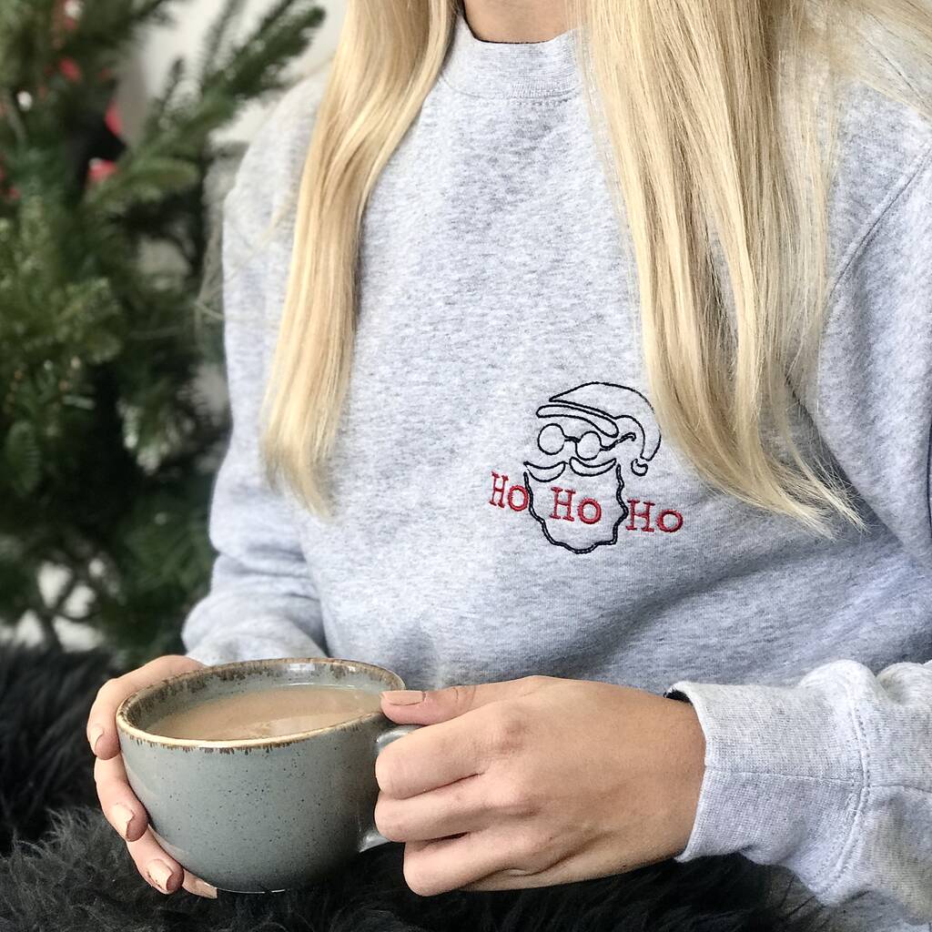 Personalised embroidered Christmas jumper with Santa outline and red “Ho Ho Ho”. A cosy festive gift for all ages, perfect for Christmas Jumper Day.