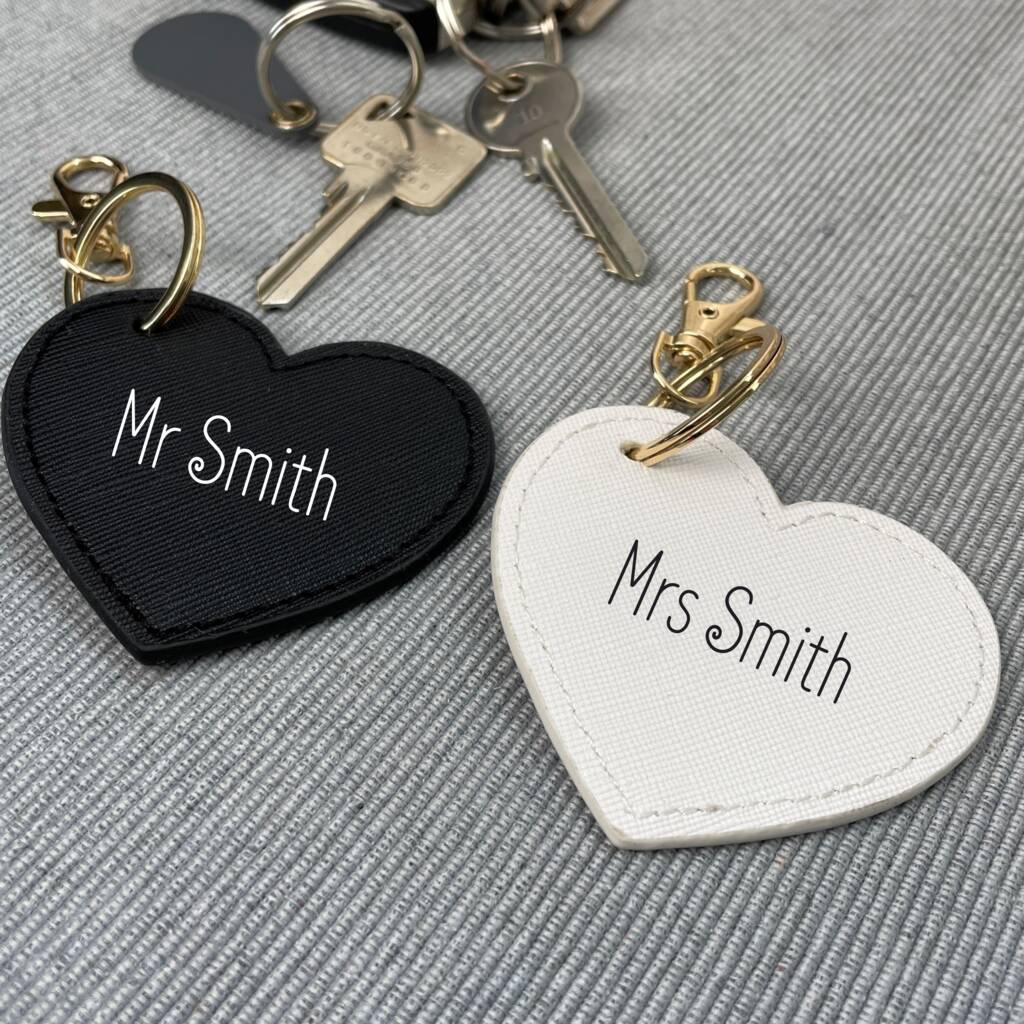 Personalised Mr and Mrs heart keyrings in black and white leather. A romantic wedding, anniversary or Valentine’s gift for couples who love meaningful keepsakes.