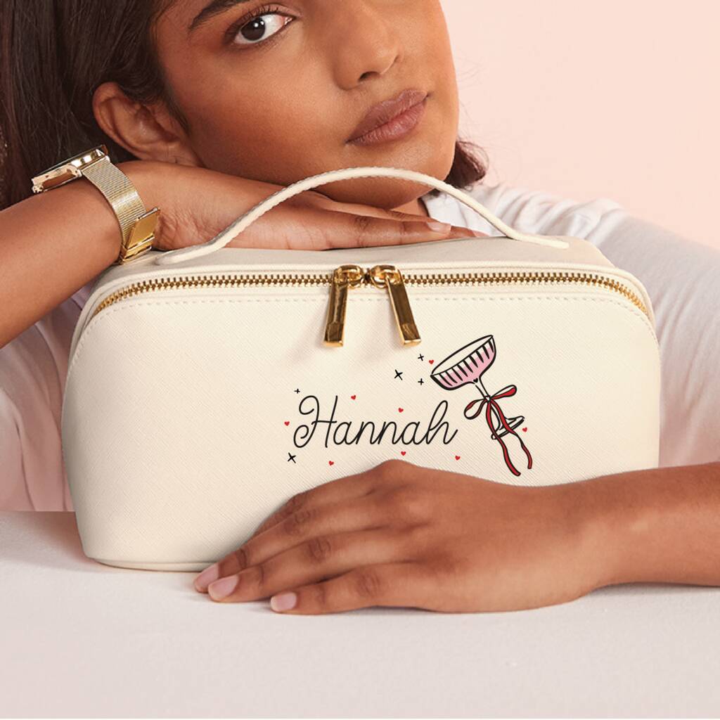 Personalised with name. Wide zip opening allows bag to open flat. Two spacious main compartments. Internal zipped slip pocket for smaller items. Structured design with carry handle. Suitable for makeup, toiletries, skincare and travel essentials.