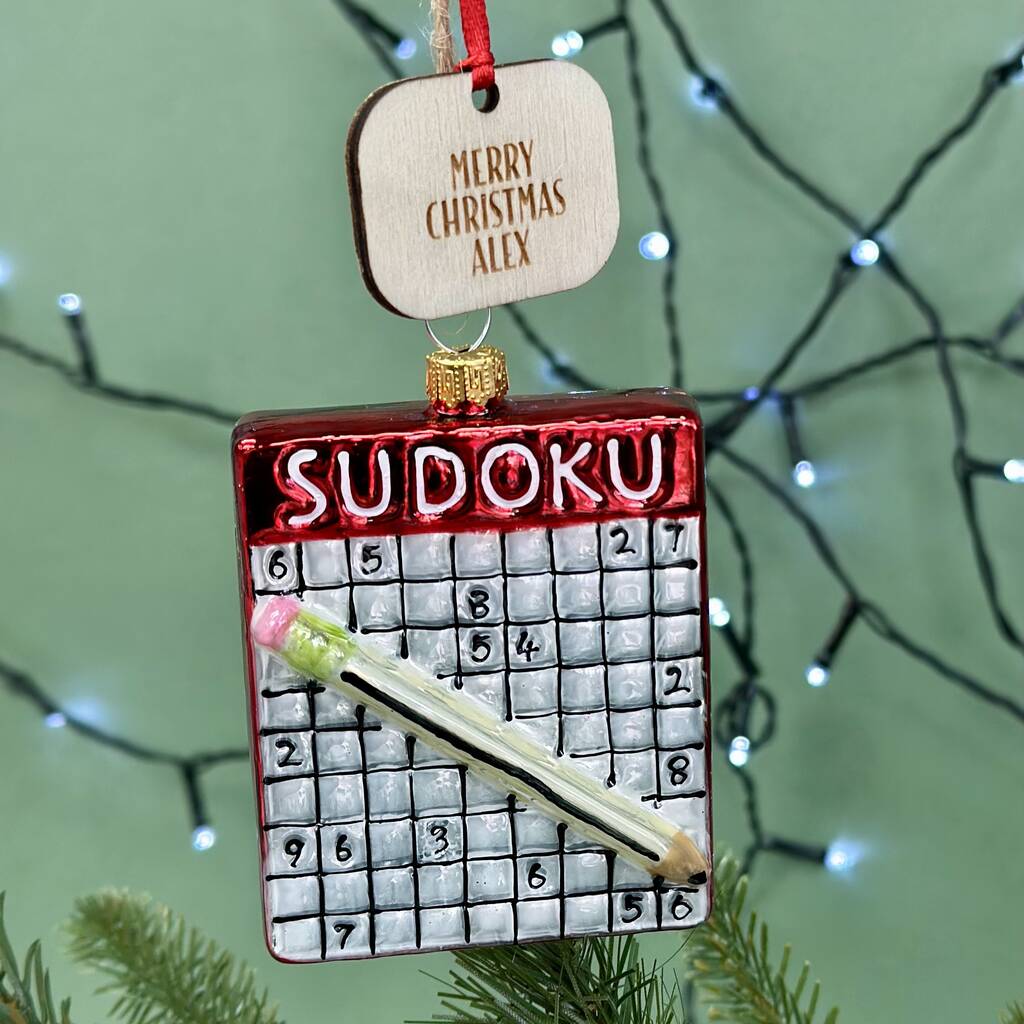 Personalised Sudoku Christmas bauble with engraved wooden tag – unique gift for puzzle lovers, perfect for festive decorations and keepsakes.
