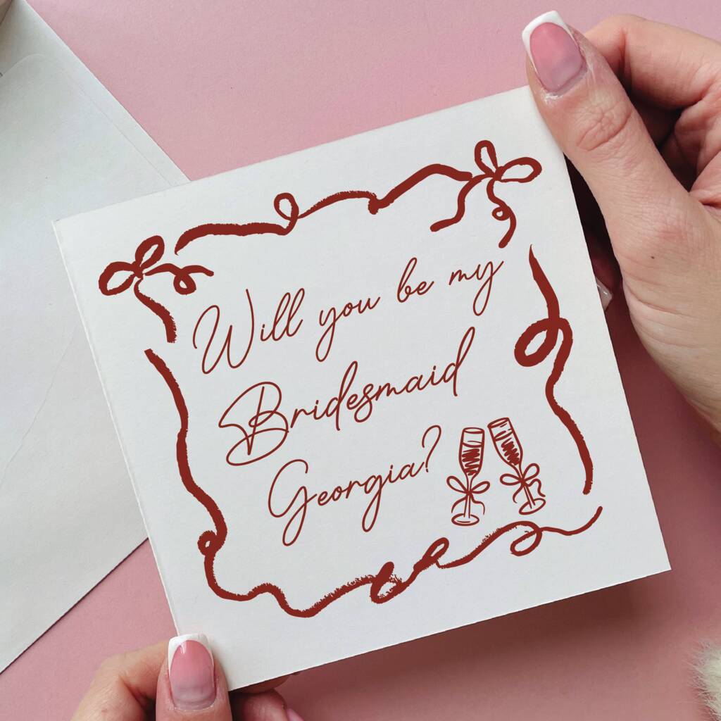 Featuring an elegant script design framed with a delicate bow border and celebratory champagne illustration, this stylish card is personalised with your bridesmaid’s name to create a meaningful keepsake she’ll treasure. Whether you’re planning a bridesmaid proposal box or asking in a special moment, this card adds a personal and heartfelt touch.