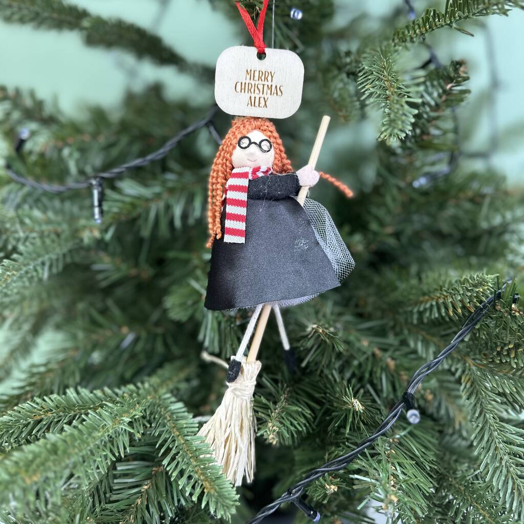Personalised witch Christmas decoration with engraved name tag — a magical festive gift for fantasy lovers and Harry Potter fans.