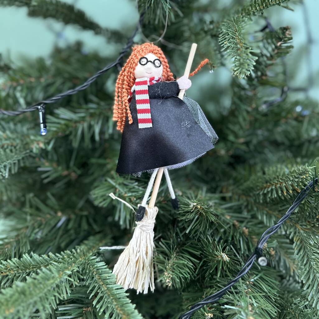 Bring a sprinkle of festive magic to your tree with this charming witch Christmas decoration, inspired by the world of fantasy and wizardry. The felt witch wears a classic pointed hat, glasses, a flowing cloak and striped scarf as she flies through the air on her broomstick — the perfect mix of whimsical and Christmassy charm.
