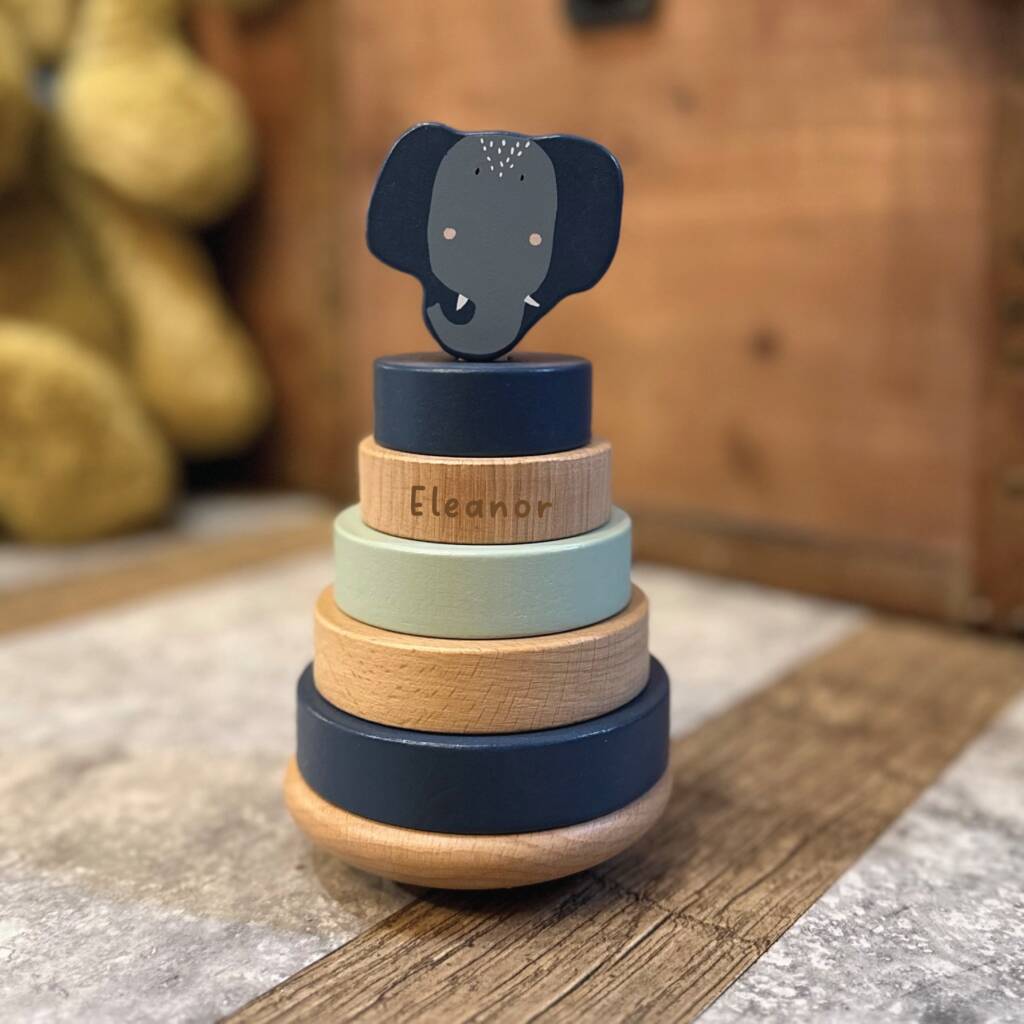 Personalised wooden elephant stacking toy engraved with a name. A charming educational toy and thoughtful new baby or first birthday gift.