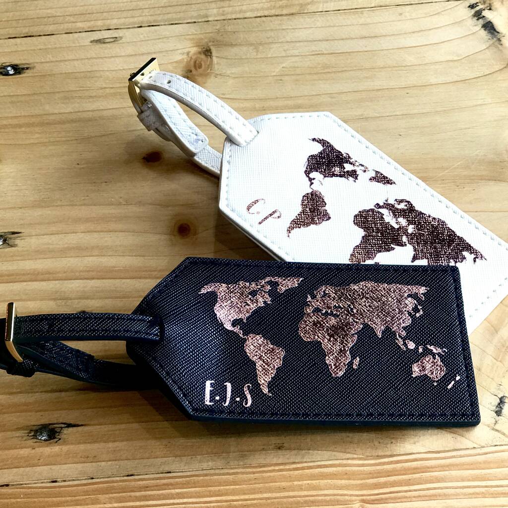 A stylish personalised luggage tag featuring a metallic gold, rose gold, or silver world map, customised with the initials of your choice.