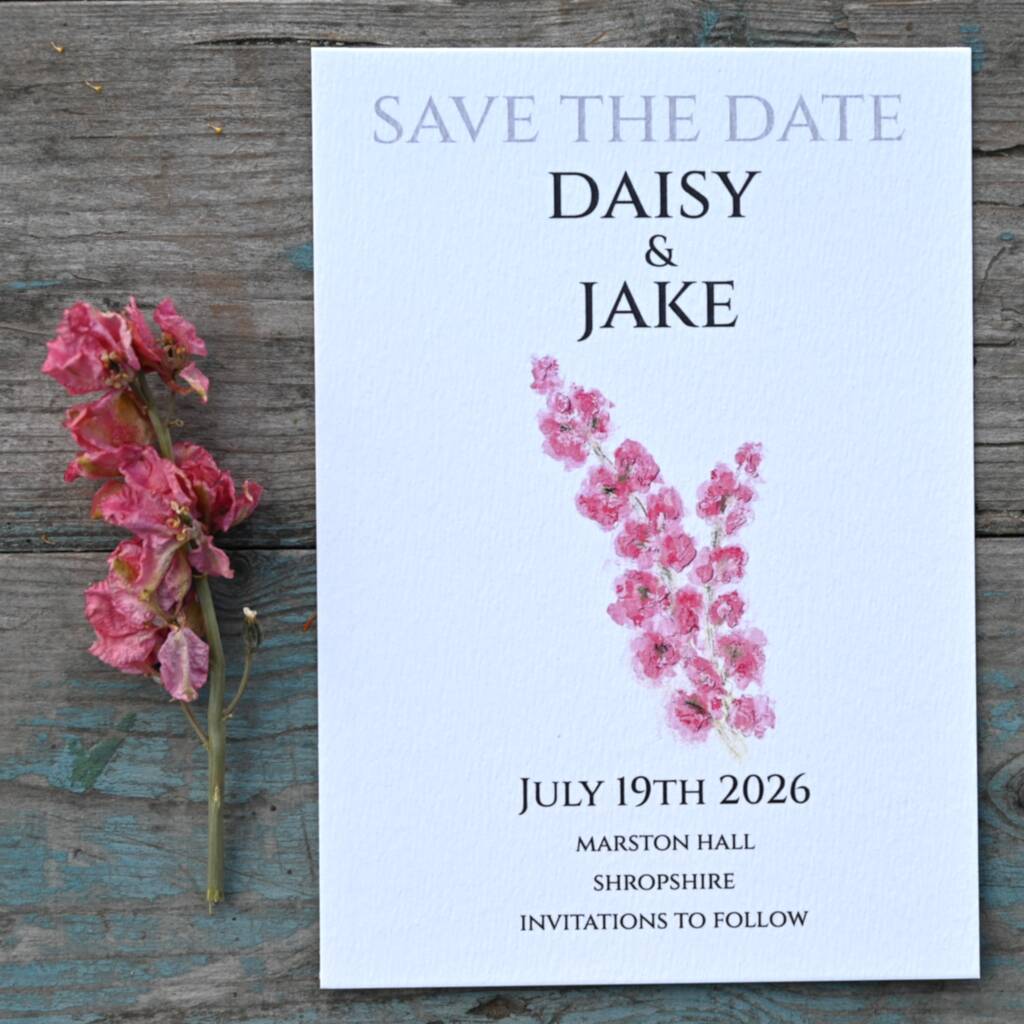 Pack 12 Cerise Larkspur Original Personalised Save The Date Wedding Stationery