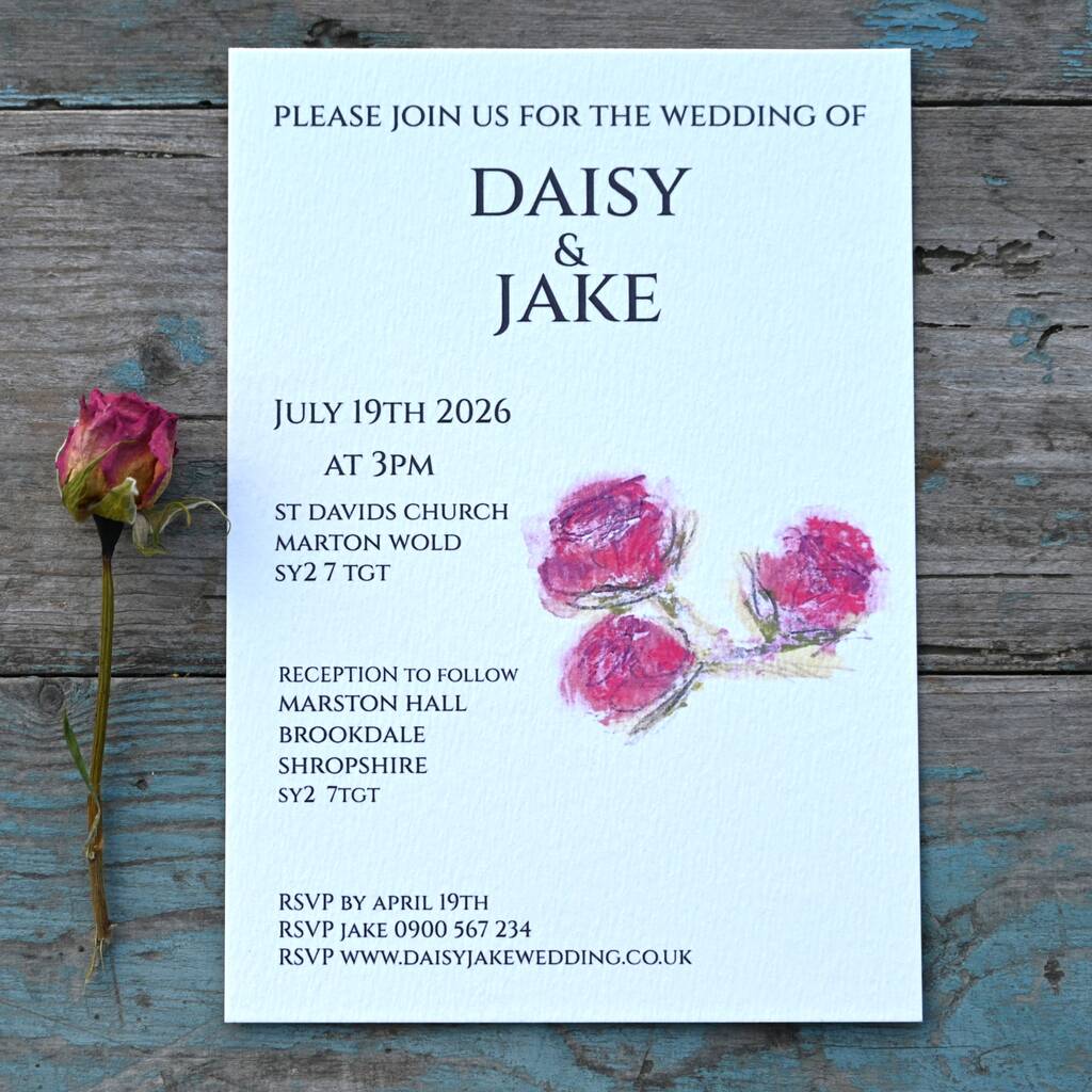 Pack 12 Cerise Rose Original Personalised Wedding Invitation