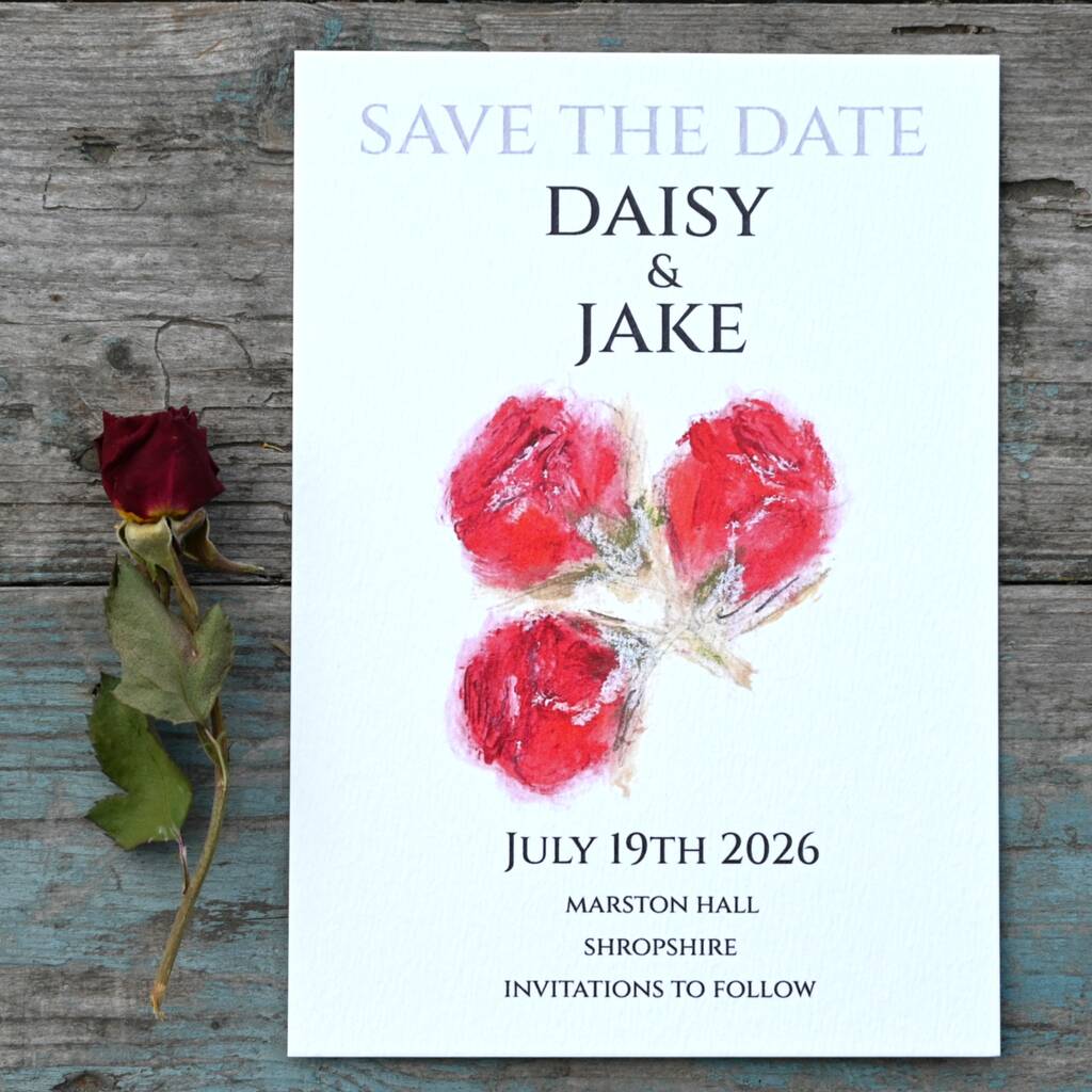 Pack 12 Red Rose Original Personalised Save The Date Wedding Stationery