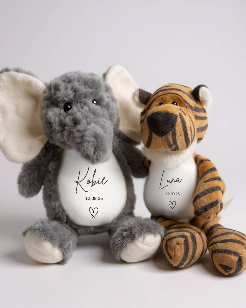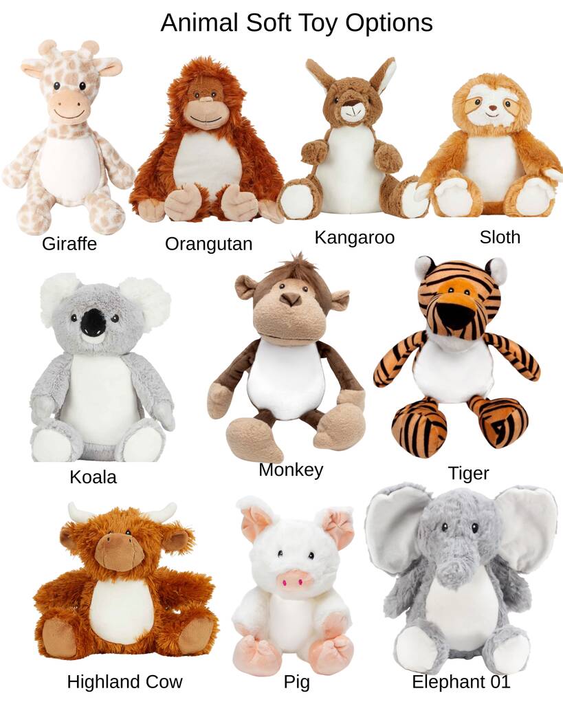 A cuddly animal soft toy with beautiful personalised name on tummy, and option to add date.