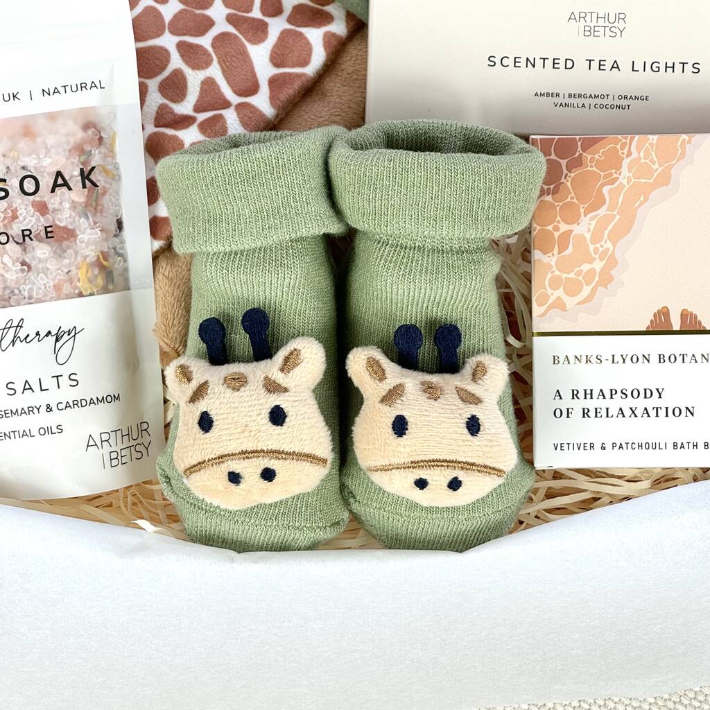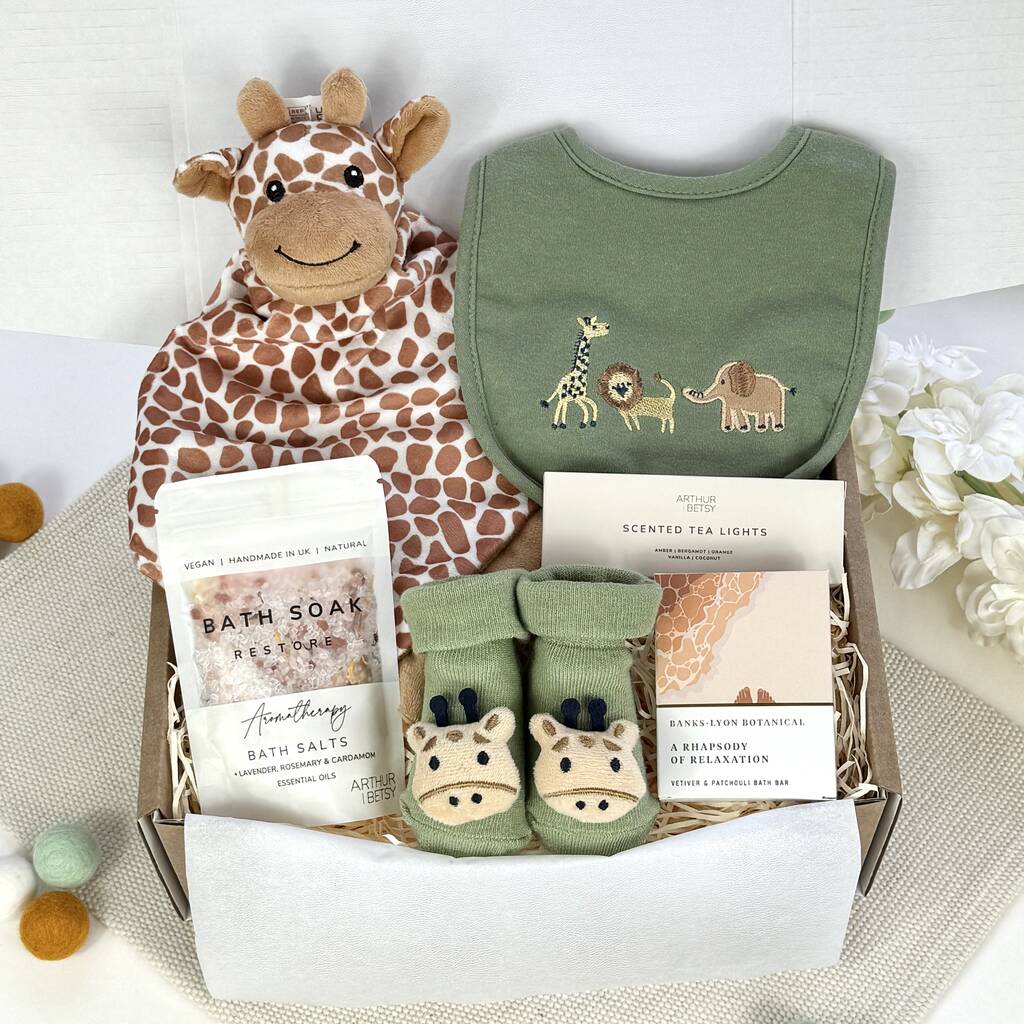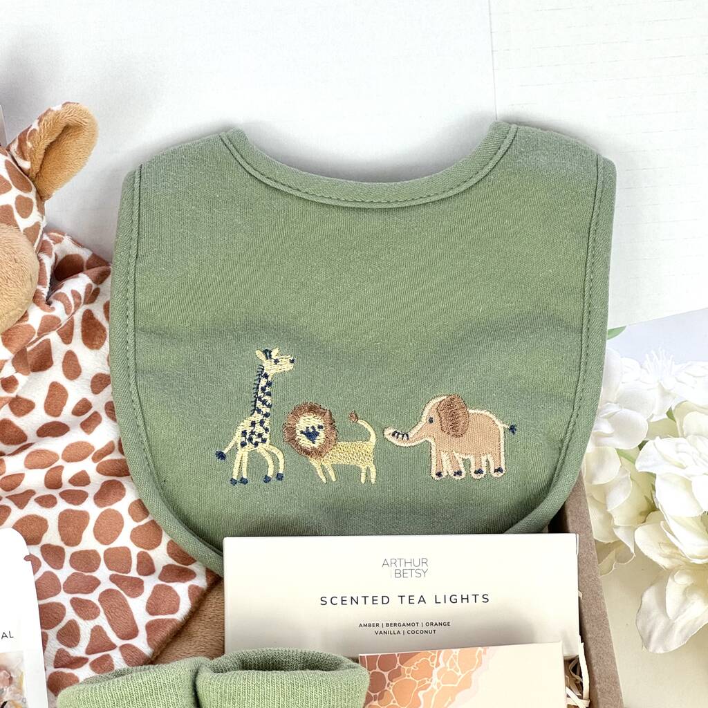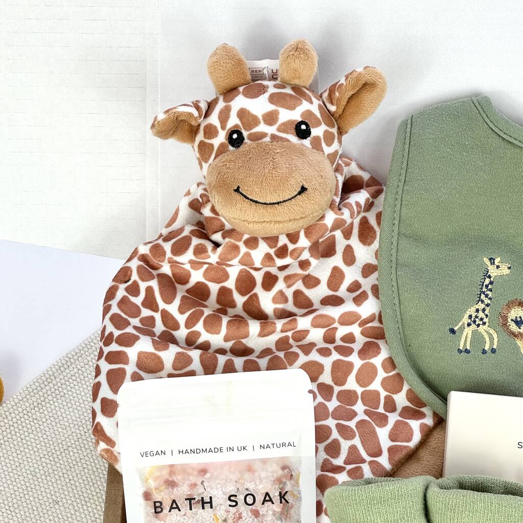 This neutrally toned gift set is a mini starter kit for the new arrival, filled with useful (and adorable!), Giraffe Safari themed presents...