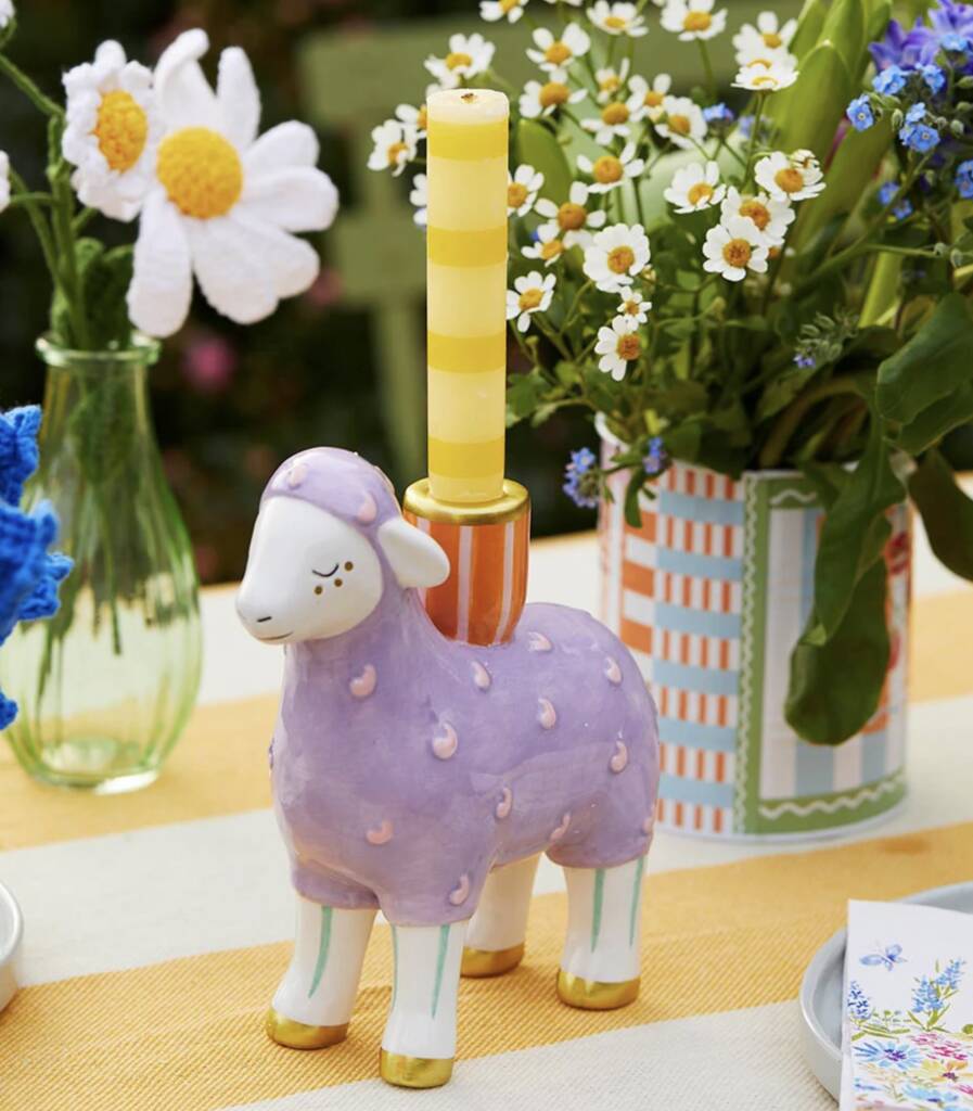This lilac ceramic lamb, finished with pastel details brings a warm feel to the table.