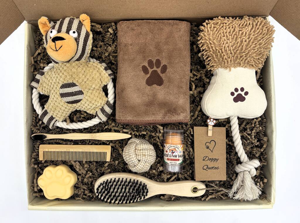 Natural Dog Pamper Gift Box | Organic Balm, Blanket, Toys, Bamboo Grooming Set Eco Friendly Puppy Spa Care Package