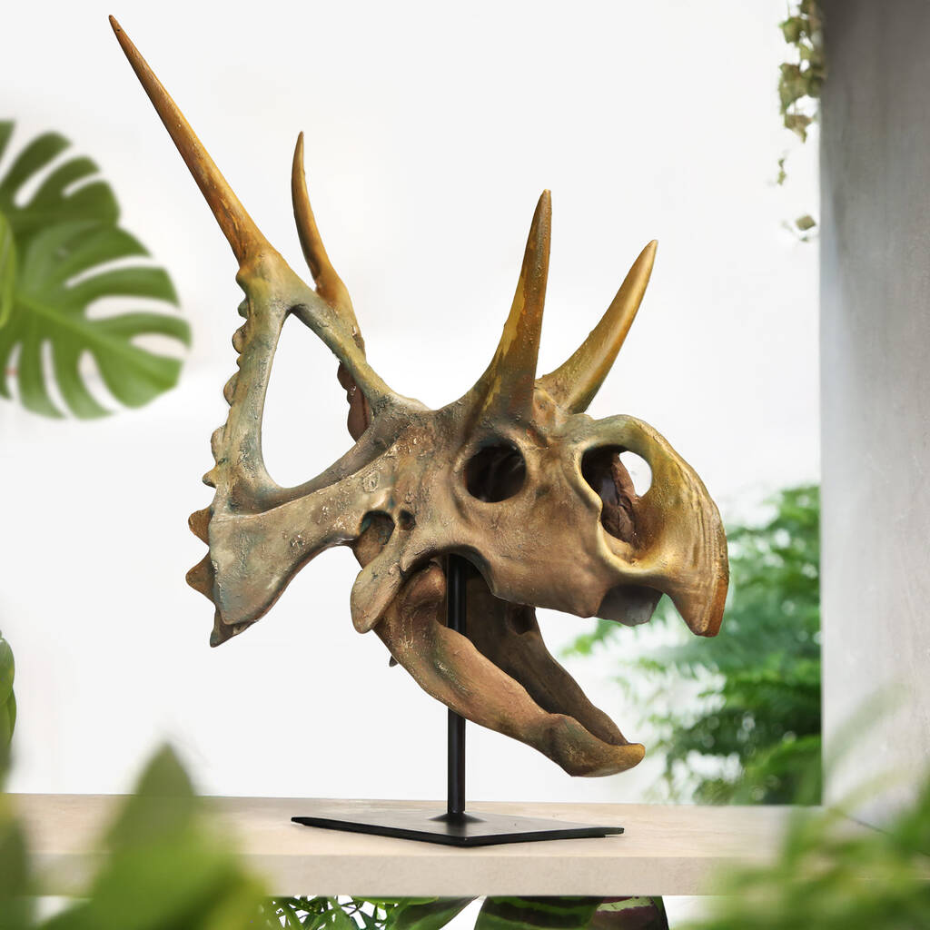 Large Hand Painted Diabloceratops Skull Dinosaur Sculpture Museum Quality 3D Resin Fossil Model On Black Metal Stand, Statement Home Decor