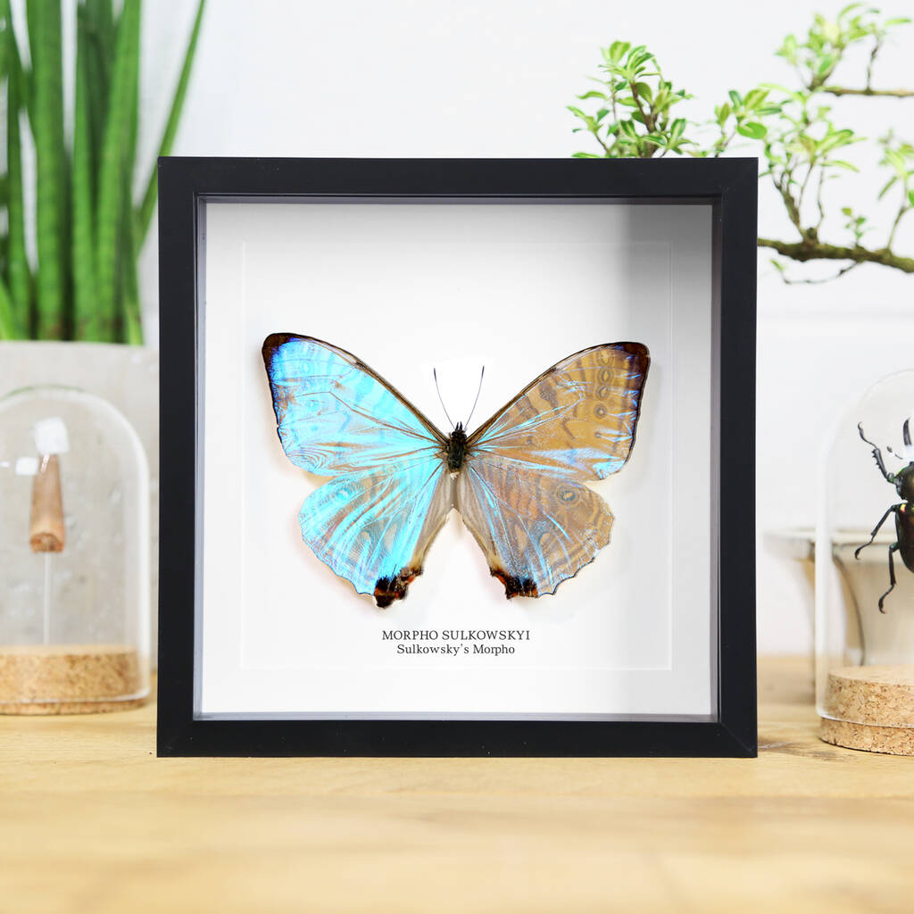 This Sulkowsky’s Morpho (Morpho Sulkowskyi) (Family: Nymphalidae) has been hand set by our expert entomologists in our studio and elegantly mounted in a museum quality deep box frame.The frame is made from premium quality, satin finished acrylic, with a museum grade 99% UV blocking conservation glass aperture. Each specimen is mounted on a 300 GSM acid free card stock which includes both the scientific and common name of the insect printed below. The frame can either be self standing or mounted using the invisible wall hanging bracket.