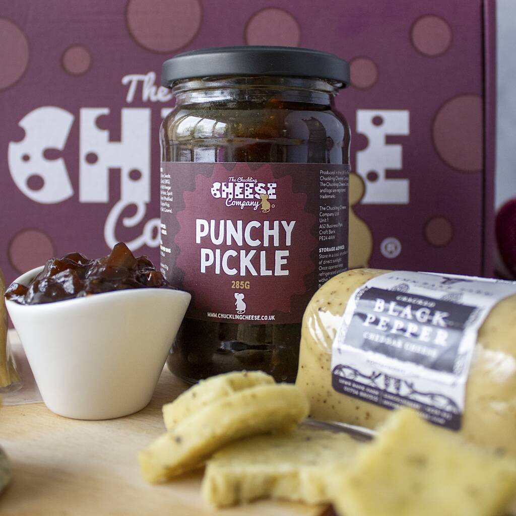 Chuckling Punchy Pickle: Vegetables (onion, swede, cauliflower, carrot) (38%), sugar, water, malt vinegar (BARLEY), date paste, spirit vinegar, thickener (modified maize starch), apple pulp, tomato paste, salt, caramel, spices.