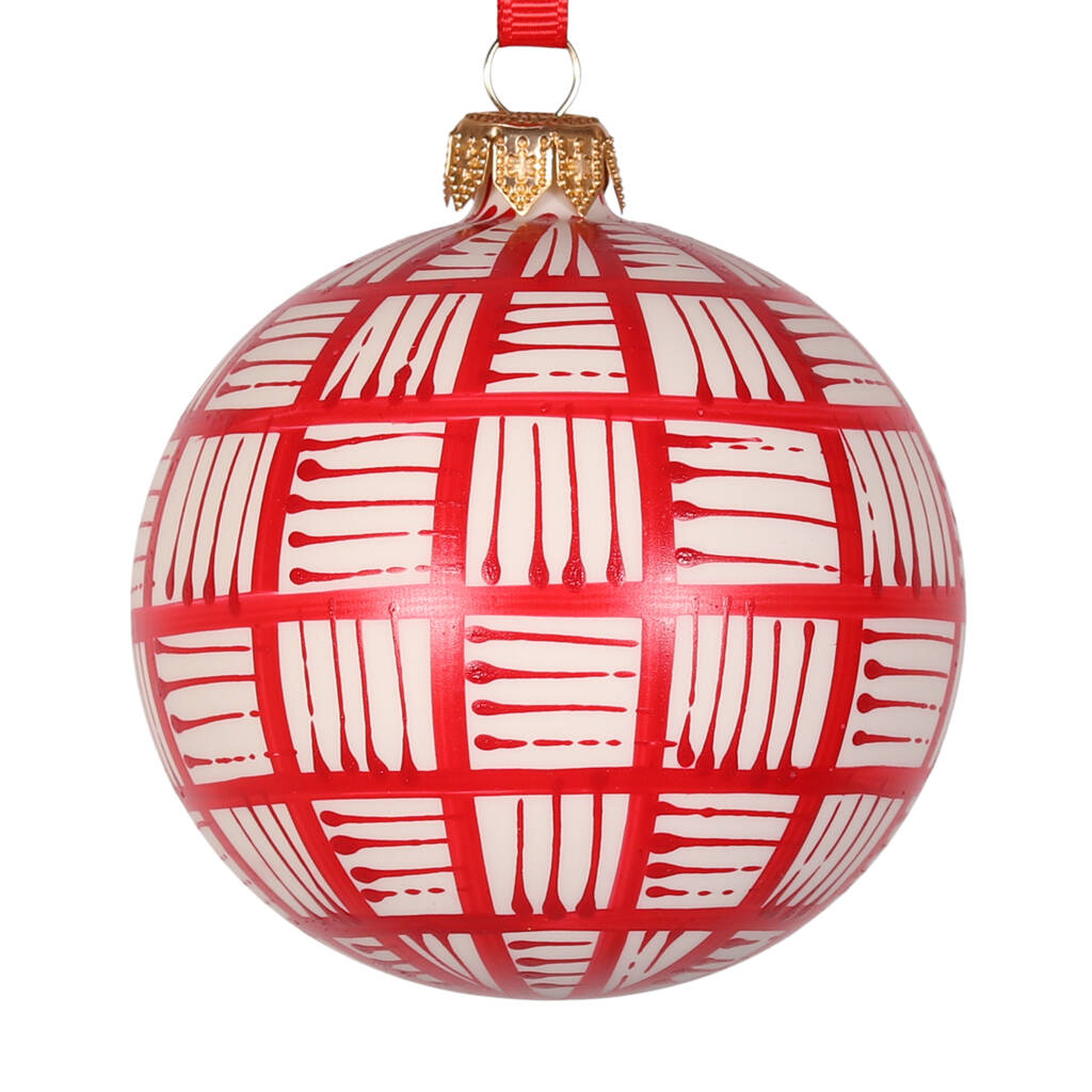 Christmas Lines Glass Bauble 8cm, Red On Natural