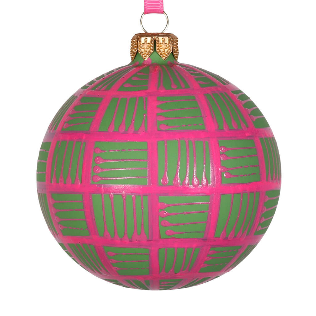 Christmas Lines Glass Bauble Pink On Green, 8cm
