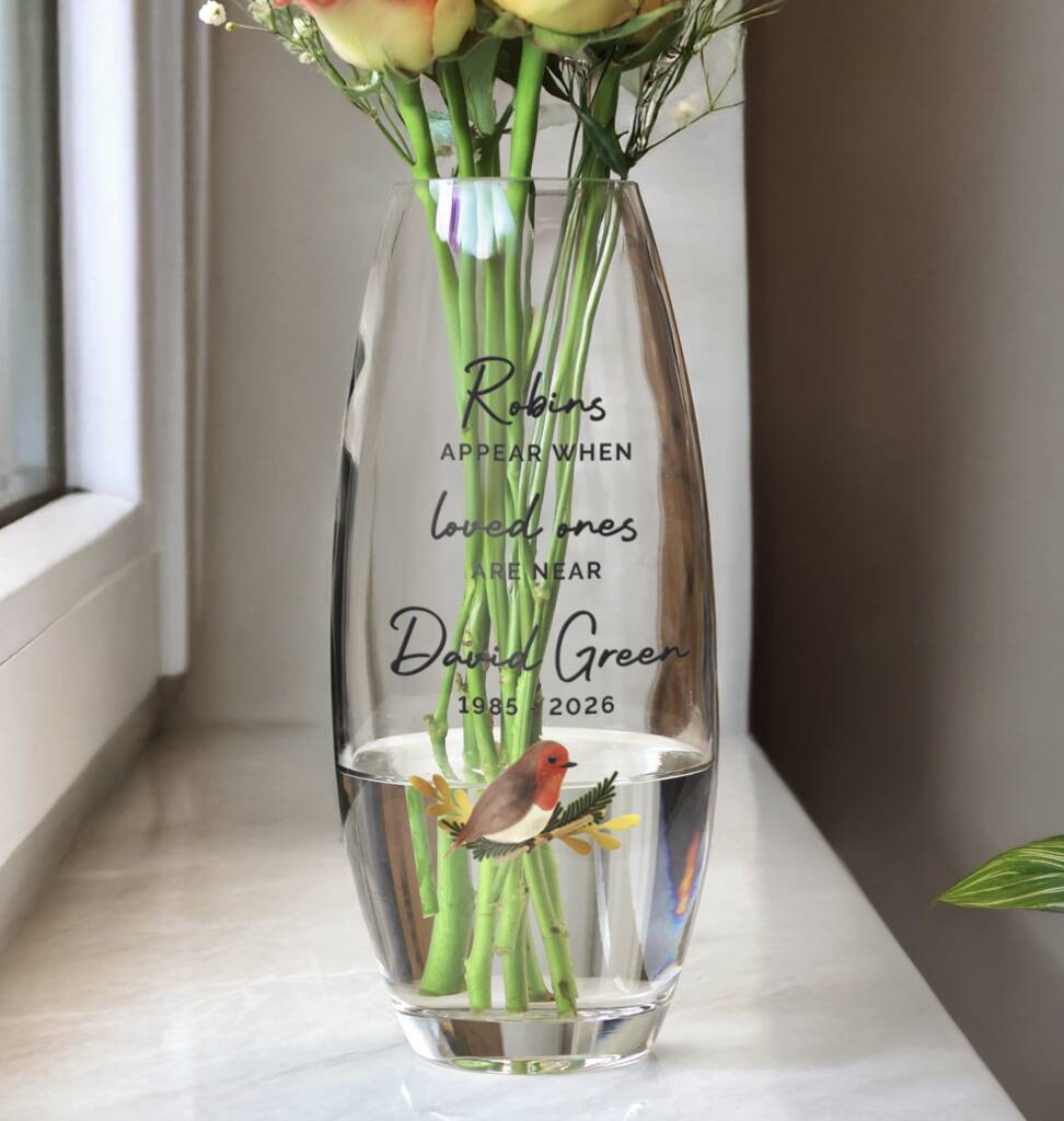 This personalised Robins Appear printed vase is a beautiful way to remember a loved one