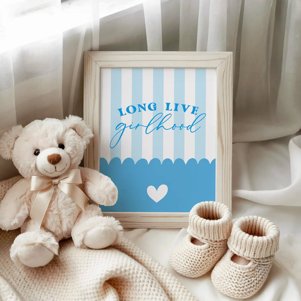 Celebrate her fearless spirit with this blue ‘Long Live Girlhood’ print — a charming nursery artwork that inspires joy, confidence, and playful creativity.