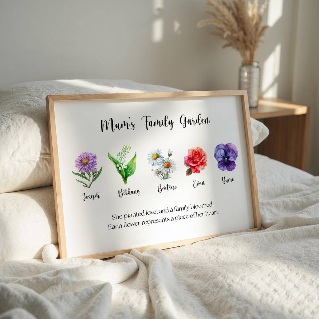 A personalised floral wall art print celebrating Mum’s “family garden” — each flower named to represent the people she loves most.