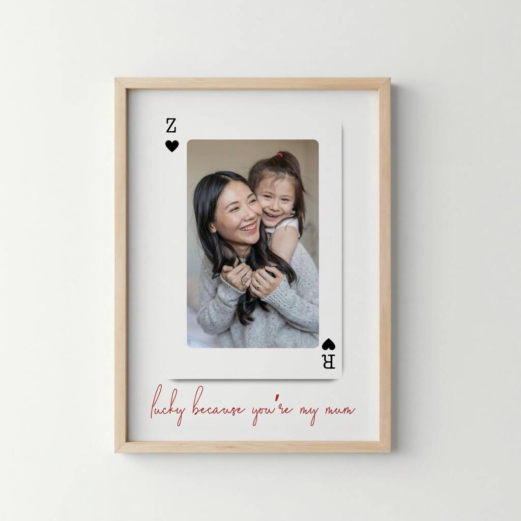 Celebrate your mum with a beautifully personalised playing card–style photo print, designed to honour the love, laughter, and everyday moments you share. Featuring your chosen photo and a subtle card detail, this modern artwork transforms a treasured memory into meaningful wall art. Printed on luxury 300gsm satin pearl lustre paper using 10 high-quality pigment dye inks for a flawless finish with rich colours and deep blacks.Available in A5, 8x10", A4, and A3 sizes, and can be framed in black or white.Designed and printed in the UK, truly ready to uplift her day.