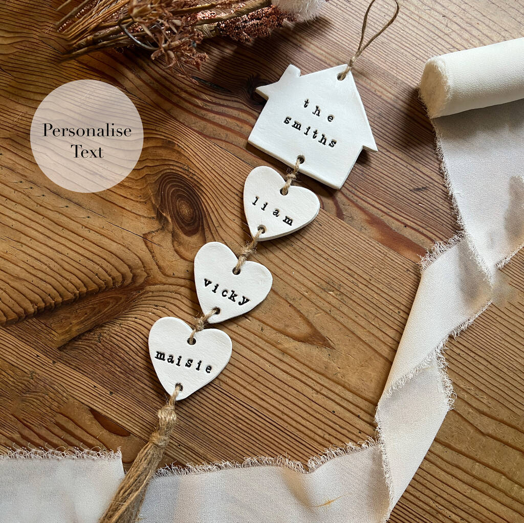 A beautiful handmade clay wall hanging ideal as a gift for them or even a treat for you! This wall hanging plaque can be personalised with every member of the family and their family surname too. This makes for a truly special present perfect for celebrating a birthday, a new home or even the arrival of a new baby!