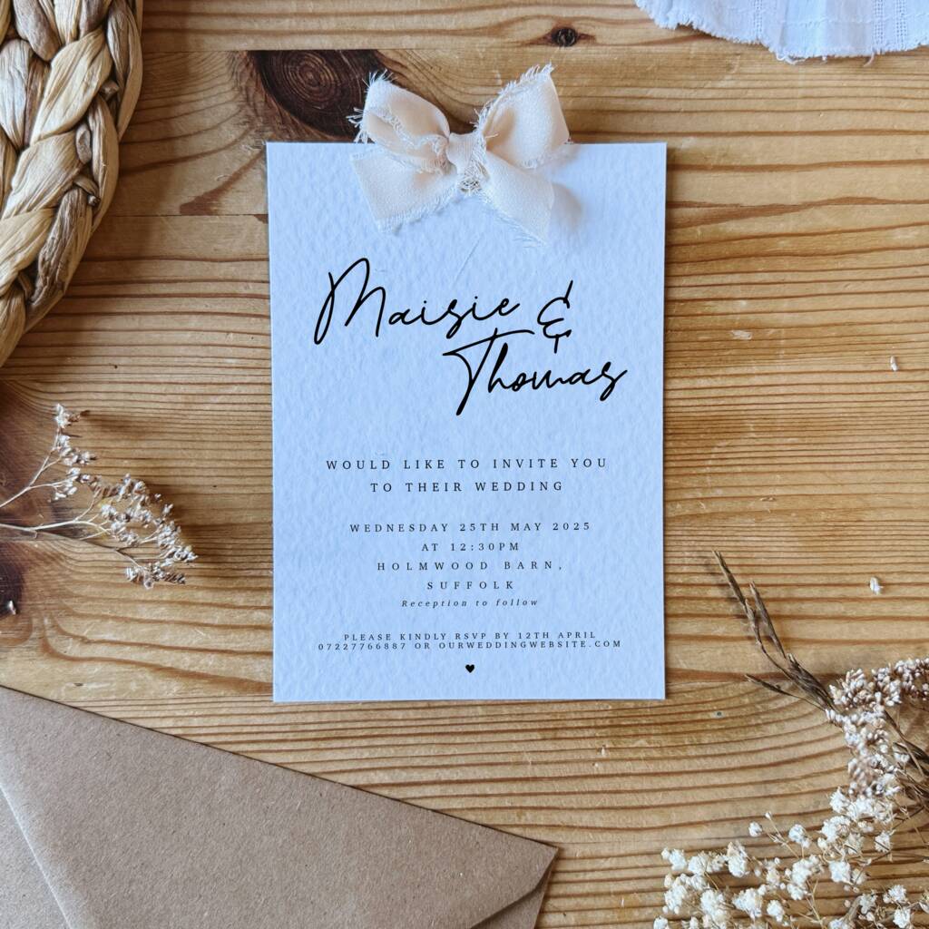 Made lovingly by hand using card and chiffon ribbon. Please bear in mind that these cards are delicate and should be handled with care. All of our invites are wrapped in tissue paper and placed in a cardboard box to ensure they reach your door as perfect as when they left ours.