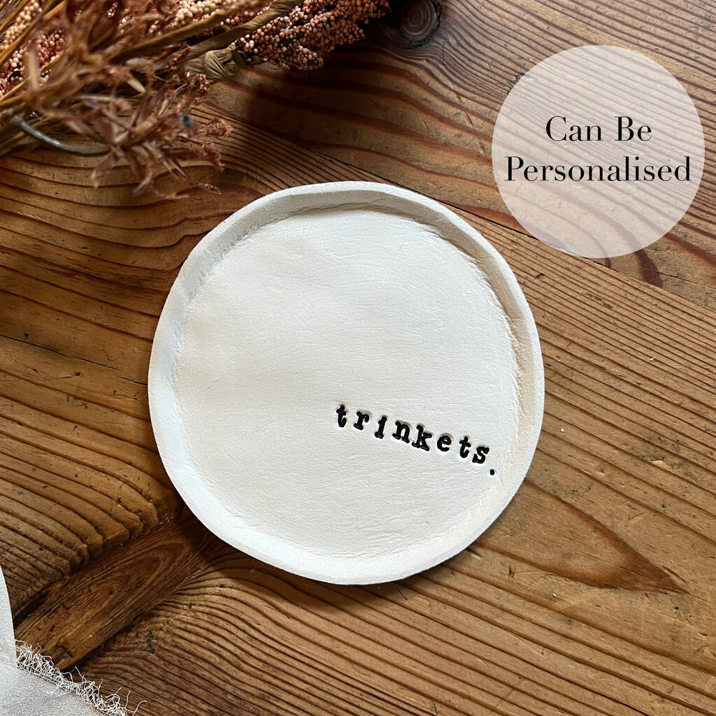 Made lovingly by hand using clay. Please bear in mind that these trinket dishes are delicate and should be handled with care. Due to our personalisation process, we only stamp on the front of the dish. All of our dishes are wrapped in tissue paper then placed in a cardboard box to ensure they reach your door as perfect as when they left ours.
