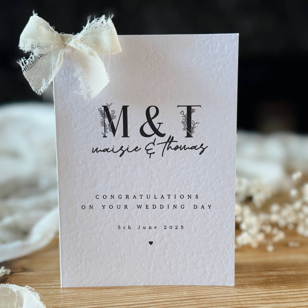 A beautiful wedding card personalised with their names and the date of their special day, perfect for wishing them congratulations on their union.
