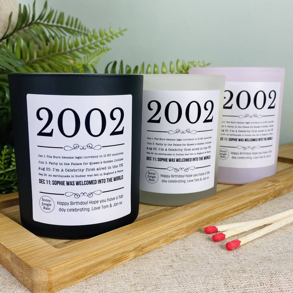 This stylish candle is the perfect gift to give anyone turning 21 years old. The playful candle places the recipients birthday in a timeline of important events from 2002. As well as being personalised with their own event headline and a message from you as the bottom.