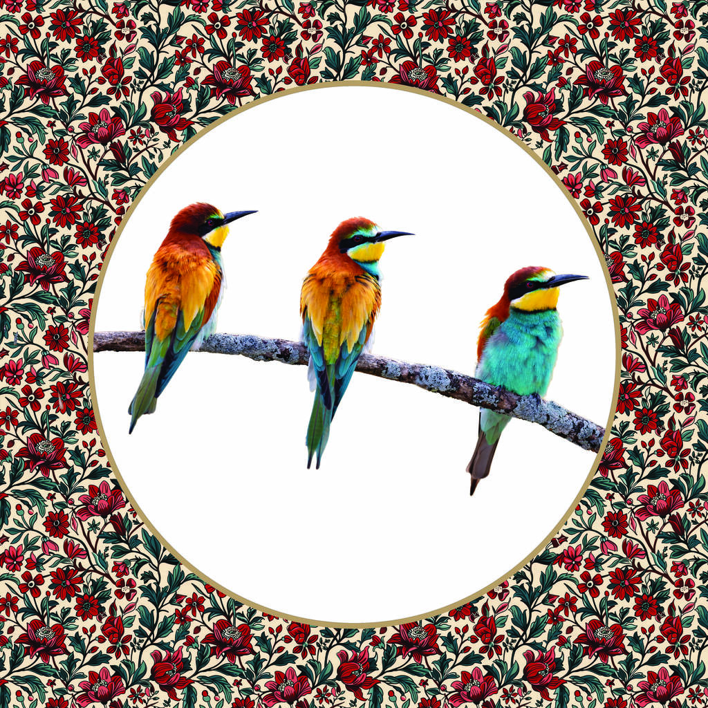 This striking artwork features three vividly coloured birds perched together on a branch, their feathers glowing in shades of amber, turquoise, and emerald. Surrounded by a rich, William Morris-inspired floral pattern in bold reds and greens, the composition blends natural elegance with classic design heritage.
