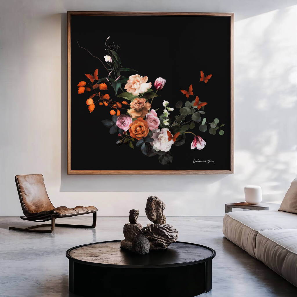 This symbolic still life brings a painterly elegance to any space, inspired by the rich beauty of modern Dutch floral art. With its harmonious balance of blooms and orange butterflies, the piece makes a meaningful gift or a serene focal point for your home.