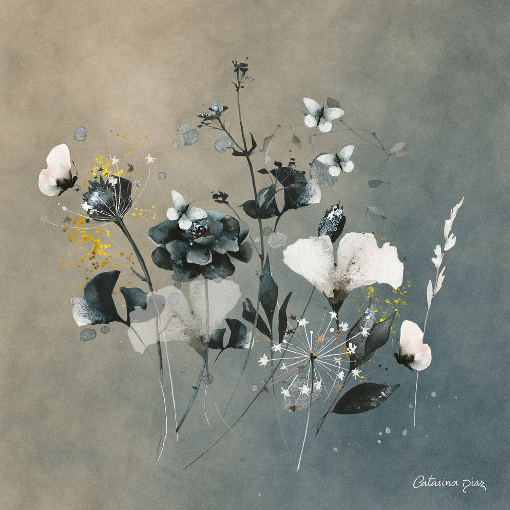 A gathering of shadowed blooms and pale butterflies, glimmering with specks of gold. It feels like nature’s quiet exhale at the edge of night — a poetic reflection of stillness and light.