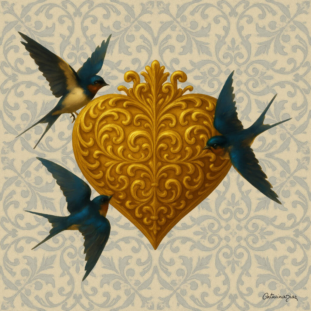 Three swallows in graceful flight circle an ornate Portuguese filigree heart—powerful symbols of migration, loyalty, and the safe return of Portuguese sailors. The golden scrollwork represents centuries of Porto goldsmith tradition, where intricate wirework creates delicate heirloom jewellery pieces.