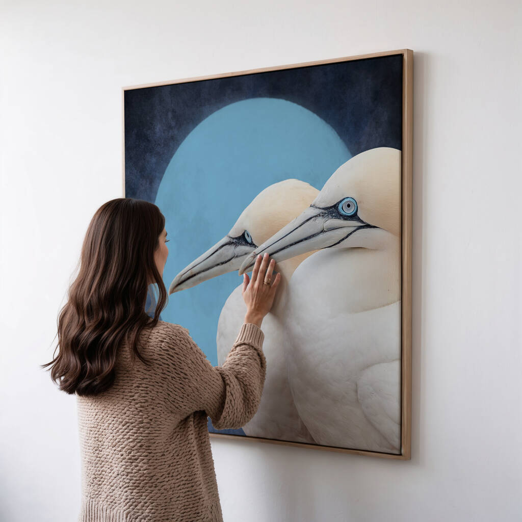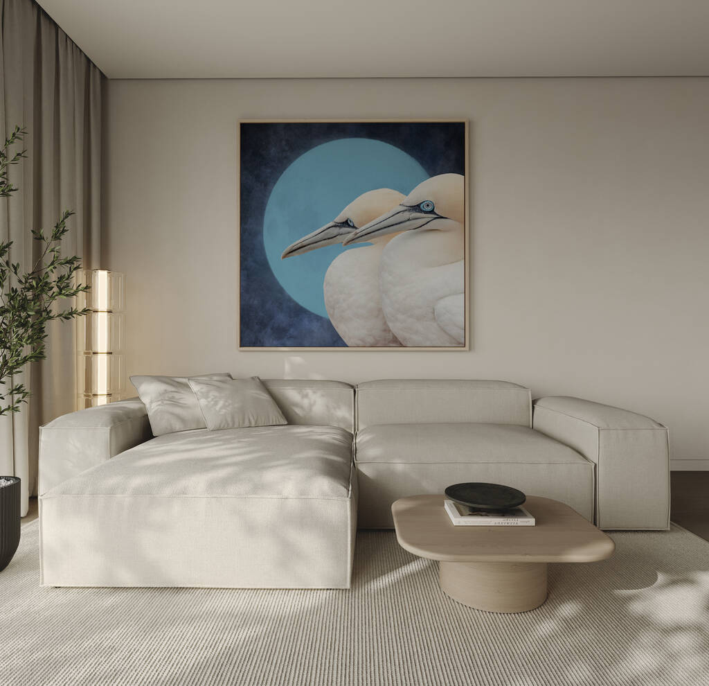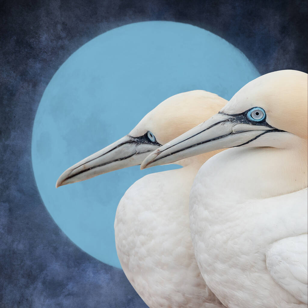 Celebrate the beauty of togetherness with Celestial Companions, a stunning fine art print featuring two graceful seabirds set against a tranquil moonlit sky. Their soft ivory feathers and piercing blue eyes are beautifully contrasted by the deep indigo background, creating an artwork that feels both peaceful and powerful.