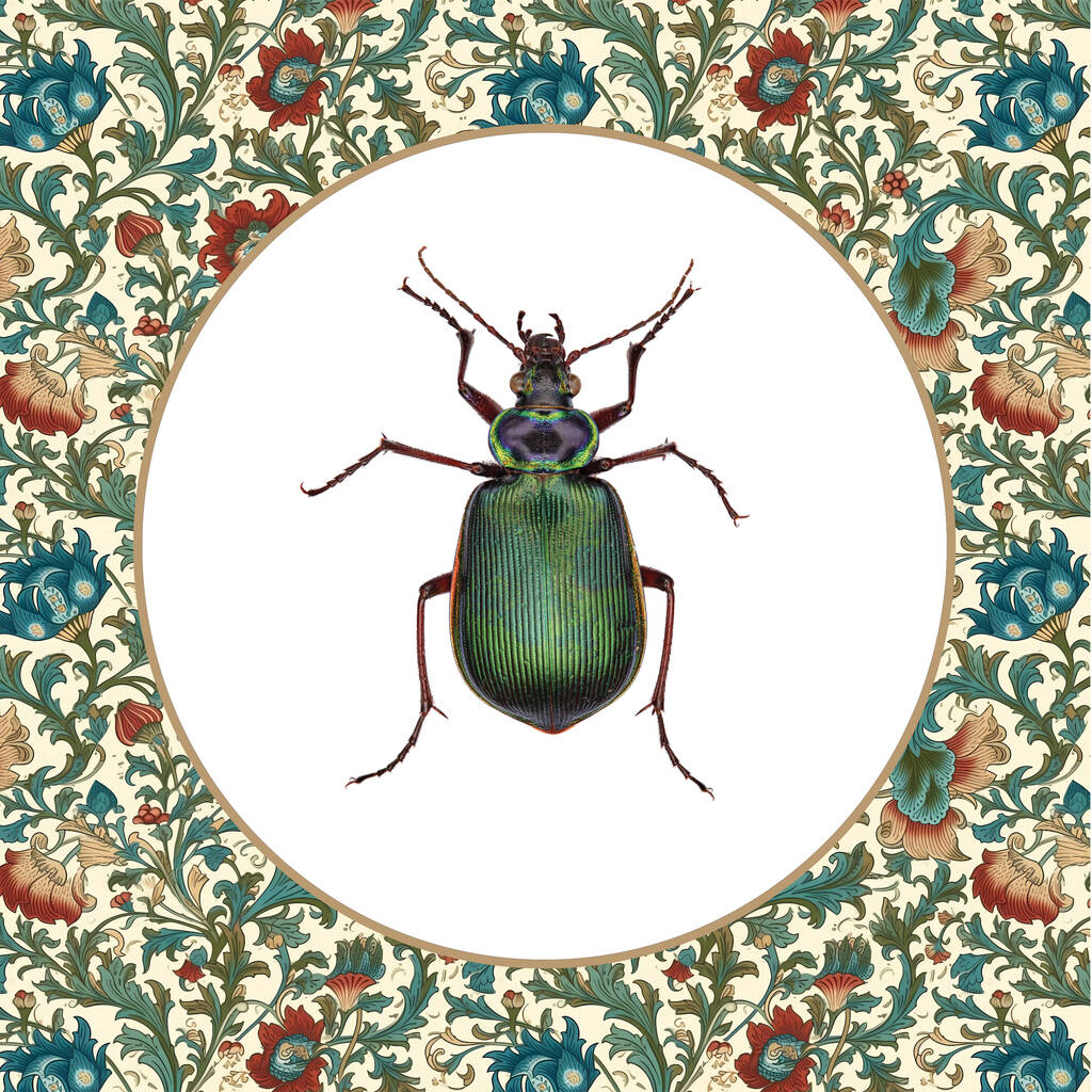This striking beetle artwork blends natural history with heritage design, showcasing jewel-toned iridescence against a William Morris inspired background for a bold and timeless statement.