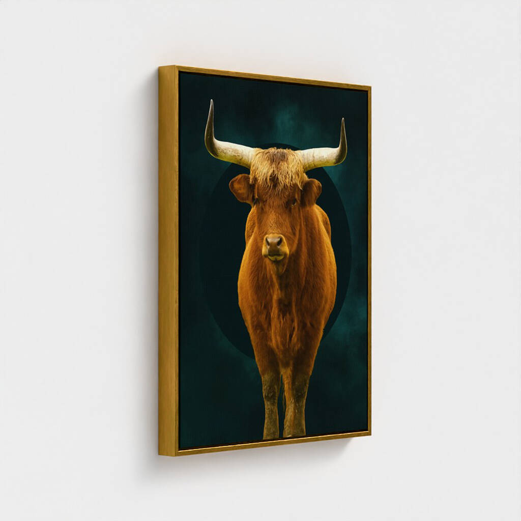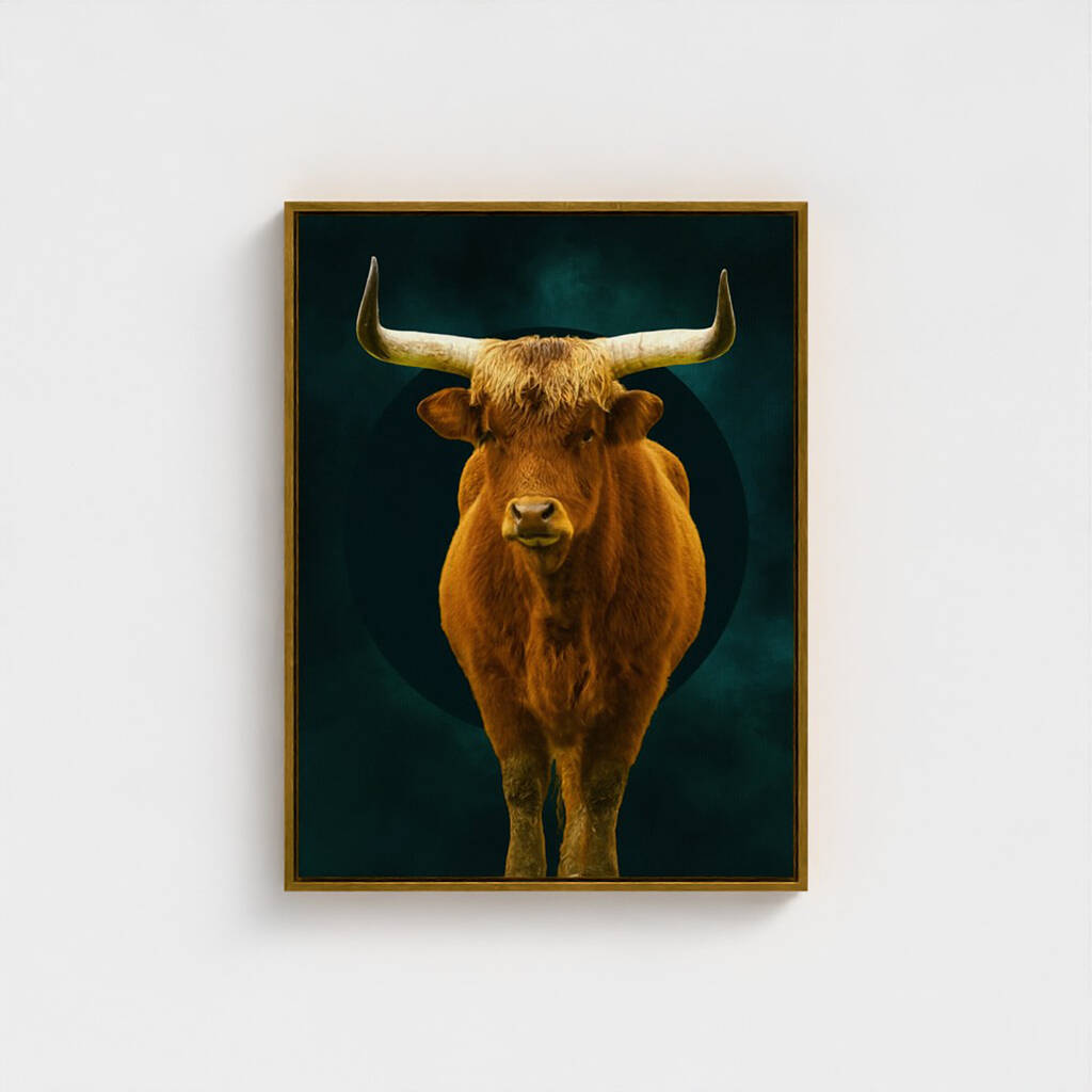 Set against a deep teal background that enhances the warmth of the cow’s coat, this print adds both contrast and calm to any interior — perfect for country homes, modern apartments, or anyone who loves a touch of the wild.